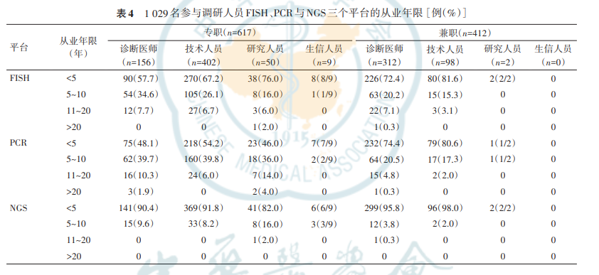 表4  1029名参与调研人员FISH、PCR与NGS三个平台的从业年限[例(%)]