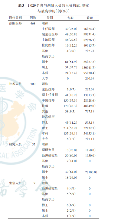 表3  1029名参与调研人员的人员构成、职称与最高学历[例(%)]