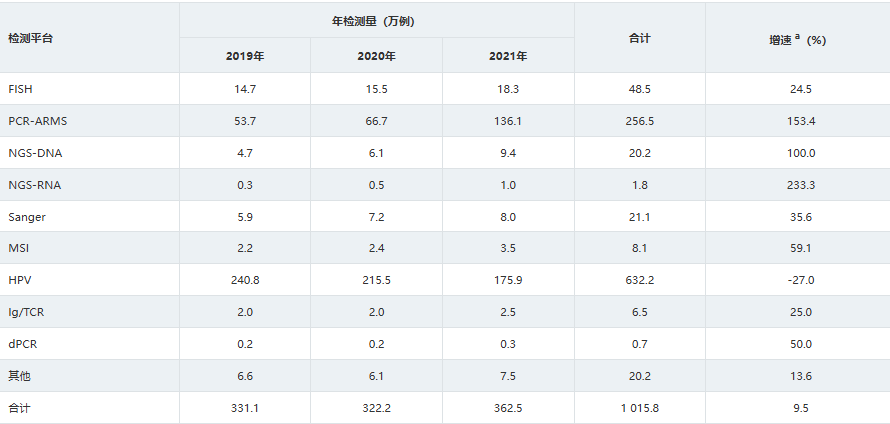 表1  365个参与调研实验室2019—2021年度各分子病理检测平台年检测量统计表