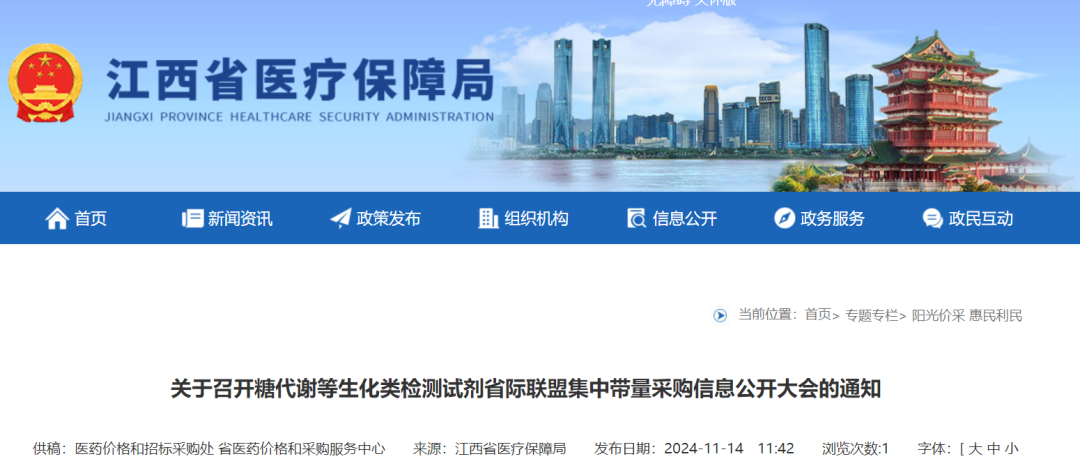 11月14日,江西省医保局发布消息,关于召开糖代谢等生化类检测试剂省际联盟集中带量采购信息公开大会的通知,确定11月25日开标。