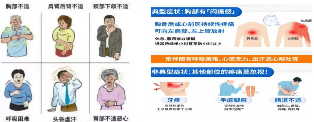 ⑤也有部分患者可能不表现出典型的胸痛症状,而是在身体其他部位出现疼痛,如颈部、咽或下颌痛,头痛、牙痛、咽喉痛、腹痛、腿痛等;