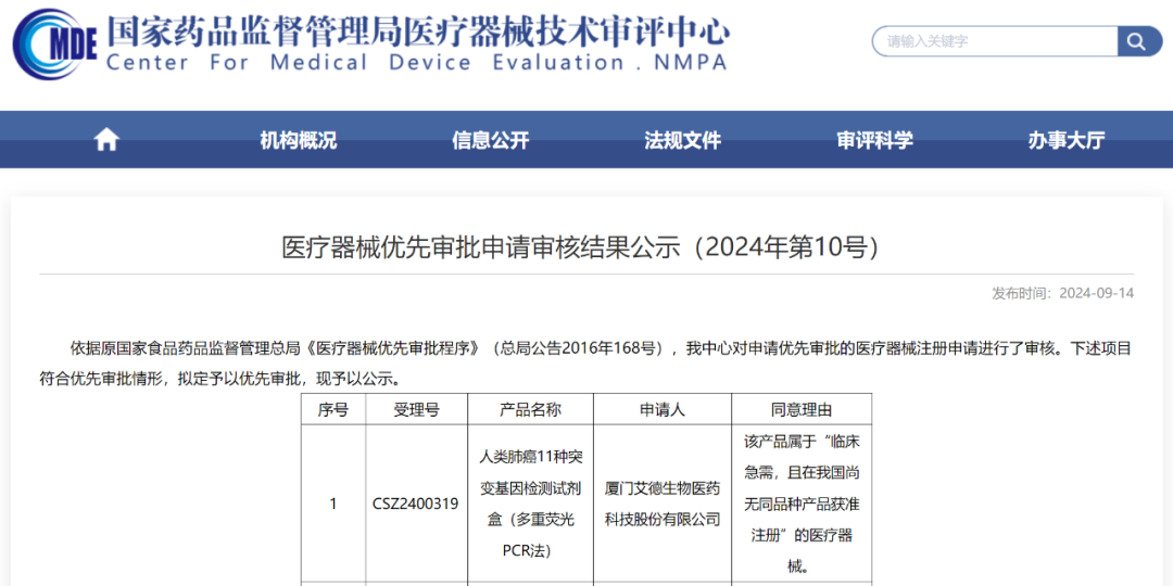 11.21号,翊新诊断技术(苏州)有限公司一款IVD领域产品进入优先通道,其同意理由为“该产品属于“列入国家重点研发计划的医疗器械””, 这是今年第7款进入优先通道的IVD领域产品,具体内容如下: 2024年其他优先审批IVD产品 截止到目前,共有7款IVD领域产品进入优先,其他6款产品内容如下: 2、FOLR1 (FOLR1-2.1) 抗体检测试剂(免疫组织化学法) 3、丙型肝炎病毒(HCV)核酸检测试剂盒(PCR-荧光法) 4、基因测序仪 5、人类肺癌11种突变基因检测试剂盒(多重荧光PCR法) 6、胚胎植入前地中海贫血检测试剂盒(半导体测序法) 来源:国家药品监督管理局医疗器械技术审评中心 |