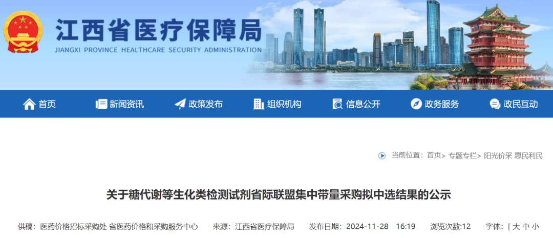 根据《糖代谢等生化类检测试剂省际联盟集中带量采购文件(JX-HC2024-02)》有关要求,现将拟中选结果(详见附件)进行公示,具体通知如下:2024年11月28日至2024年12月2日。如有异议,请于公示期内提出申诉,并提供合法有效证据材料,逾期原则上不予受理。对公示内容有异议的,请于2024年12月2日17:00前登录江西省药品和医用耗材招采子系统,进入“耗材办事大厅-其他-糖代谢等生化试剂集采拟中选结果公示”,按要求提交加盖单位公章的材料。投诉材料请提供合法有效的佐证依据。业务咨询电话:0791-86390516,0791-88102300北京豪迈生物工程股份有限公司的离子微量元素 | 钙(CA)人份包装,最低中选价格为0.03元,也就是3分钱;从中选金额来看,毫升共3.18亿,人份共1.36亿,合计4.54亿需求。