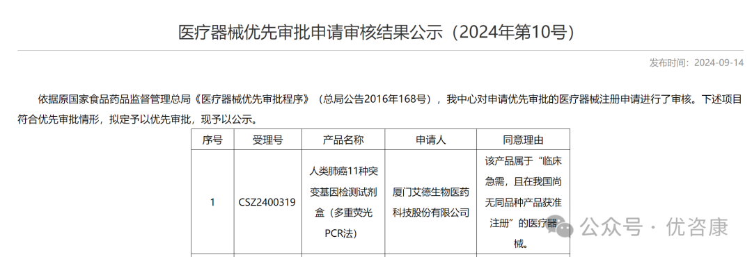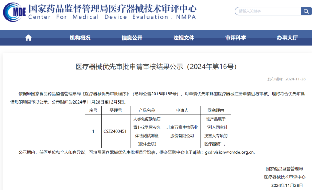 | 11.28号,北京万泰生物药业股份有限公司的“人类免疫缺陷病毒1+2型尿液抗体检测试剂盒(胶体金法)”进入优先通道,其同意理由为“该产品属于“列入国家科技重大专项的医疗器械””,这是今年第8款进入优先通道的IVD领域产品,其中6款产品的同意理由为:列入国家科技重大专项或者国家重点研发计划的医疗器械 1. 哪些产品可以进行优先注册? 根据《体外诊断试剂注册与备案管理办法》第七十二条满足下列情形之一的体外诊断试剂,可以申请适用优先注册程序: (一)诊断罕见病、恶性肿瘤,且具有明显临床优势,诊断老年人特有和多发疾病且目前尚无有效诊断手段,专用于儿童且具有明显临床优势,或者临床急需且在我国尚无同品种产品获准注册的医疗器械; (二)列入国家科技重大专项或者国家重点研发计划的医疗器械; (三)国家药品监督管理局规定的其他可以适用优先注册程序的医疗器械。 根据《医疗器械注册与备案管理办法》第七十三条满足下列情形之一的医疗器械,可以申请适用优先注册程序: (一)诊断或者治疗罕见病、恶性肿瘤且具有明显临床优势,诊断或者治疗老年人特有和多发疾病且目前尚无有效诊断或者治疗手段,专用于儿童且具有明显临床优势,或者临床急需且在我国尚无同品种产品获准注册的医疗器械; (二)列入国家科技重大专项或者国家重点研发计划的医疗器械; (三)国家药品监督管理局规定的其他可以适用优先注册程序的医疗器械。 目前进入优先通道的8款产品,其中6款产品的同意理由为:列入国家科技重大专项或者国家重点研发计划的医疗器械;1款产品同意理由为:诊断或者治疗罕见病、恶性肿瘤且具有明显临床优势;1款产品同意理由为:临床急需且在我国尚无同品种产品获准注册的医疗器械。 2. 2024年其他7款优先审批IVD产品 截止到目前,共有8款IVD领域产品进入优先,其他7款产品内容如下: |