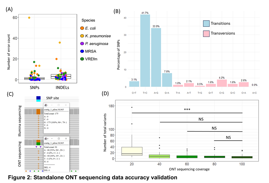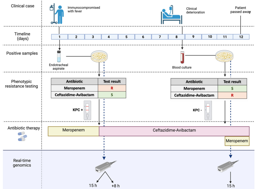 细菌和病毒 ROC 曲线分析 文献二 靶向和无偏宏基因组结合的双流程纳米孔测序技术能够快速准确诊断下呼吸道感染 作者: Yifan Guo, Zhenzhong Li, Lijuan Li,. et al. DOI:https://doi.org/10.1016/j.ebiom.2023.104858 解读 纳米孔宏基因组学已被用于细菌病原体的感染疾病诊断。然而,这项技术目前在临床环境中对细菌、真菌、和病毒的检出性能尚缺乏全面的研究。 研究团队开发了一种用于单样本的双流程纳米孔测序技术,该技术在宏流程中进行无偏好的宏基因组学研究,在靶向流程中进行靶向富集(纳米孔Meta-Panel流程,NanoMP),并前瞻性地从多中心收集了450例下呼吸道标本。基于21种物种的正交实验,通过机器学习和ROC曲线建立的过滤体系提高对病原检测的准确性。 流程示意图 在这项前瞻性大队列研究中,研究团队使用了450例临床呼吸道样本来评估纳米孔测序检测感染病原体的性能,建立了一种Dual-barcode的涵盖DNA/RNA病原体检测的NanoMP方法。利用机器学习和ROC曲线建立可用于临床样本的病原检测过滤体系并有望扩展到其他研究中。同时根据临床结果,也评估了基于SNPM数据库建立的AMR基因检测方法的临床检测性能。本次通过涵盖细菌、真菌和病毒以及AMR基因检测的多中心、大队列临床研究,和建立的病原水平的方法学性能评价和样本水平的临床性能评价的两级性能评价体系,更能反应出纳米孔测序的真实临床应用表现。 基于临床判断的纳米孔测序病原体检测和AMR基因鉴定的性能 文献三 纳米孔测序在病原微生物检测中的应用专家共识 作者: 张述耀,侯铁英,黎小妍,钟诗龙,伍俊妍,黄彬 DOI:https://doi.org/10.1016/j.ebiom.2023.104858 解读 感染性疾病是由病原微生物引起的疾病的统称,目前仍然是全球公共卫生的重大威胁。实现病原微生物的快速精准检测对于感染性疾病的诊治具有非常重要的临床价值。 随着基因组学技术的发展,高通量测序技术为病原微生物的鉴定提供了新的技术手段。该技术通过对样本核酸序列的测定可以实现传染病病原微生物的快速准确鉴定,而且检测通量高、耗时短,正越来越多地应用于临床感染性疾病的诊断和疫情防控之中。 目前,高通量测序技术(也称“新一代测序技术”),泛指第二代测序技术(next generation sequencing technique,NGS)和第三代测序技术(third-generation sequencing technique,TGS)。其中,NGS测序通量高,但其测序读长较短,导至后续在进行生物信息学分析时基因组拼接困难,且测序时存在高GC偏好性,上述缺点使其应用受限,也因此推动了TGS的发展。TGS因其超长的测序读长弥补了NGS的不足,逐渐被应用于临床各个领域。 依据检测目的和方法的不同,TGS主要分为靶向测序(targeted next generation sequencing,tNGS)、宏基因组测序(metagenomics next generation sequencing,mNGS)和全基因组测序(whole genome sequencing,WGS)等方向;依据测序原理的不同,则可分为纳米孔电信号测序[以纳米孔单分子测序(以下简称“纳米孔测序”)为代表]和单分子荧光信号测序[以单分子实时测序(single molecule realtime,SMRT)技术为代表]。 其中,纳米孔测序具有设备小型化、便携的特点,可以在床旁、野外开展样本检测,符合临床上即时检测的需求,可缩短临床病原微生物的诊断时间,改善抗生素滥用问题。近年来纳米孔测序已经在病原微生物检测、感染性疾病甚至重大公共卫生问题流行期间的诊断与防治等领域发挥了重要作用,也有多项基于纳米孔测序病原微生物检测的多中心研究开展,由此可见,纳米孔测序在临床病原微生物检测领域具有独特的优势及广阔的应用前景。 文献四 通过实时基因组学检测隐藏的抗生素耐药性 作者: Themoula Charalampous, Gemma L. Kay, Hollian Richardson, Justin O’Grady DOI:https://doi.org/10.1038/s41587-019-0156-5 解读 耐药性感染由于治疗延迟或不适当而导至更高的死亡率和发病率,快速准确地识别耐药细菌病原体可以促进早期给予适当的治疗,降低死亡率和感染和治疗相关的发病率。 基于纳米孔测序长读长的优势可以用来创建高度精确的、接近完整的基因组组装,用于菌株水平的鉴定和细菌病原体及其抗生素耐药性的从头检测。尤其复杂感染情况下,快速准确的靶向治疗可能对患者的预后特别有益,纳米孔测序技术提供了在临床环境中直接加速病原体鉴定和抗生素耐药性分析的潜力。 作者针对一例多重耐药性肺炎克雷伯菌的病例利用纳米孔测序技术开展的实时基因组学研究,验证了该技术能显著增强对抗生素耐药性检测的能力,能够揭示传统检测手段可能遗漏的耐药机制,加快临床决策的制定,进而提升患者的治疗效果。 该感染病例的病程和治疗方法概述 纳米孔测序在治疗前分离株中检测到传统诊断方法遗漏的低丰度质粒介导的耐药基因 blaKPC-14 抗性基因的单个拷贝,它解释了本病例研究中对头孢他啶-阿维巴坦的耐药性,同时可能恢复体外碳青霉烯类敏感性。 治疗前后分离株的基因组和质粒从头组装 因此,基于基因组学的耐药预测不仅与传统诊断确定的耐药模式一致,而且还确定了blaKPC-14 是假定的耐药机制(见下表) 实时基因组学诊断结果 纳米孔测序可在1.5小时内提供初始数据,比传统方法所需的52小时快得多,便于及时干预。通过纳米孔选择性测序进行抗生素耐药性分析具有快速和原位分析的特性,针对性地选择最合适的药物和治疗方法,从而提升患者的治疗体验和生活质量。 此研究展示了经