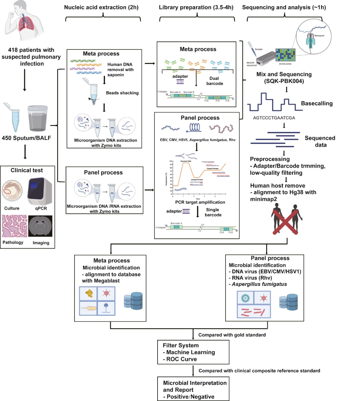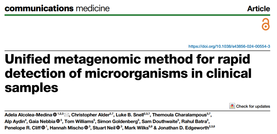 混合感染是指同时感染2种及2种以上的病原体,多为支原体、病毒、细菌间的组合感染。跟单一病原感染一样,混合感染一般会出现咳嗽、咳痰、咽痛、流鼻涕、发烧、乏力等症状。不同的是,混合感染的症状相对较重,早期难以辨明病因,导至病程变长、用药增多、治疗难度加大,重症风险显著升高,可能对病人的免疫功能造成一定的损害,甚至对肺部造成一定的影响。 纳米孔基因测序作为最新一代商用的测序技术,具有长读长、速度快、操作简便等优势,病原检测覆盖范围广,可检测未知病原,可实时获取结果、为实现病原快速检测分析和辅助感染性疾病精准防治提供了有力支持。 本期带您了解纳米孔测序技术用于混合感染领域和病原微生物快速检测的相关研究成果。 文献一 作者: Sauerborn, E., Corredor, N.C., Reska, T. et al. DOI: https://doi.org/10.1038/s41467-024-49851-4 解读 在疑似传染病出现时,常规诊断手段如培养、靶向多重PCR和抗原检测往往需要数日才能得出完整结果,这可能导至在感染初期关键阶段错失诊断和治疗的良机。在本项研究中,研究人员开发了一种综合的宏基因组学方法,运用纳米孔测序技术同步检测人体样本中的病原RNA和DNA,彰显了该技术在未来传染病诊断中的广阔应用前景。 工作流程示意图 研究亮点: