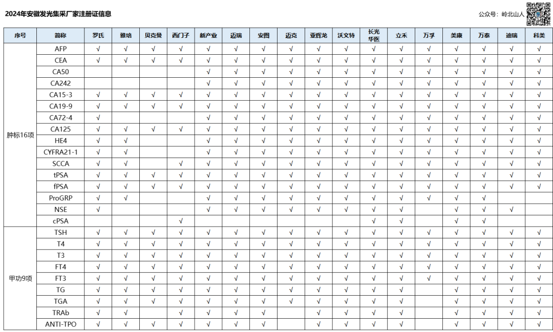 2024年由安徽省、北京市、天津市、河北省、山西省、内蒙古自治区、辽宁省、吉林省、黑龙江省、上海市、福建省、江西省、河南省、湖北省、湖南省、广西壮族自治区、海南省、重庆市、四川省、贵州省、云南省、西藏自治区、陕西省、甘肃省、青海省、宁夏回族自治区、新疆维吾尔自治区、新疆生产建设兵团 28 省(区、兵团)医疗保障局组成采购联盟。经历过两次的带量采购后,目前只有山东、广东、江苏、浙江未参与。血清甲胎蛋白、癌胚抗原、糖类抗原50、糖类抗原242、糖类抗原153、糖类抗原199、糖类抗原724、糖类抗原125、人附睾蛋白4、细胞角蛋白十九片段、鳞状细胞癌相关抗原、前列腺特异性抗原、游离前列腺特异性抗原、胃泌素释放肽前体、神经元特异性烯醇化酶、结合前列腺特异性抗原。促甲状腺素、血清甲状腺素、血清三碘甲状腺原氨酸、血清游离四碘甲状腺原氨酸、血清游离三碘甲状腺原氨酸、甲状腺球蛋白、甲状腺球蛋白抗体、促甲状腺激素受体抗体、抗甲状腺过氧化物酶抗体。肿瘤标志物、甲状腺功能联合检测试剂不纳入本次集中带量采购。申报企业为已取得本次集中带量采购产品合法资质的医疗器械注册人(代理人),其中境外医疗器械注册人(代理人)应当指定我国境内企业法人协助其履行相应的法律义务,委托其作为申报企业。同一医疗器械注册证不得委托不同企业进行申报。如医疗器械注册人(代理人)间为同一实际控制人或存在控股关系或医疗器械注册证明确委托生产关系的,则视为企业间存在关联关系,可委托同一家企业申报,应提交一份唯一报价的申报材料。肿瘤标志物十六项和甲状腺功能九项两类产品分别组套采购,整体统一竞价。组套内所有产品首年意向采购量累计相加后,从多到少依次排序,累计意向采购量前 90%涵盖的企业进入A竞价单元组,其余进入B竞价单元组。若A组申报企业数目不足7家,则按照排序补足7家,其余进入B组;B组企业补充进入A组的过程中,如果最后一个名额有多家采购需求量相同的企业,则全部进入A 组。若B组递补后≤2家,则全部纳入A组。 甲状腺功能产品三碘甲状原氨酸(T3)检测试剂盒、甲状腺素(T4)检测试剂盒、促甲状腺激素(TSH)检测试剂盒、游离三碘甲状原氨酸(FT3)检测试剂盒、游离甲状腺素(FT4)检测试剂盒产品不足5项的进入C组。按“拟中选规则一”未能中选的企业,两类产品若整体申报降幅高于50%(>50%),增补为拟中选企业,不受中选采购企业数量限制,其拟中选排名位列按“拟中选规则一”中选企业之后。按照拟中选规则一拟中选的企业,若 B、C 组的拟中选价格高于同检测项目的A组平均中选价,企业需接受调平至A组平均中选价后拟中选,拟中选排名顺序不调整,若企业不接受调平,则取消中选资格,不递补。按照拟中选规则二拟中选的企业,若B、C组的拟中选价格高于同检测项目的A组最低中选价,企业需接受调平至A组最低中选价后拟中选,若企业不接受调平,则取消中选资格。医疗机构报送需求的产品若在中选范围,对应意向采购量全部计入该中选产品的首年协议采购量;医疗机构报送需求的产品若未在中选范围,对应的意向采购量作为该组待分配量,A组和B组的待分配量不互通。意向采购量为未中选产品的,由该医疗机构优先选择拟中选排名最高的企业产品,若医疗机构申报的所有意向采购量企业全部未中选,由医疗机构在中选企业中自行选择。按“拟中选规则二”拟增补的中选企业,不参与待分配量的分配。甲状腺功能检测九项的 C 组未中选产品不分量。根据国家药品监督管理局网站查询,此次集采,常规项目的注册证相对较全,个别项目注册证数量较少。部分厂家注册证情况如下:如cPSA注册证目前只有五家,进口厂家中,西门子,国产厂家中,厦门万泰、美康生物、长光华医、苏州立禾四家拥有cPSA的注册证。 |