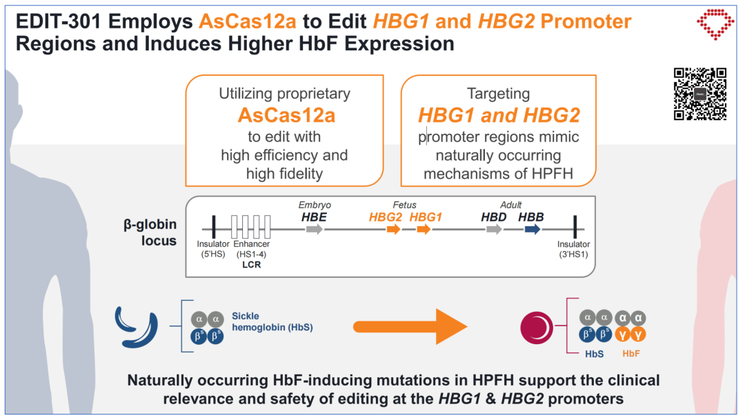 EDIT-301由患者来源的CD34+造血干细胞和祖细胞(HSPCs)组成,这些细胞在γ-珠蛋白基因(HBG1和HBG2)的启动子区域通过CRISPR-Cas12a核酸酶进行编辑,以诱导胎儿血红蛋白(HbF)的表达。
