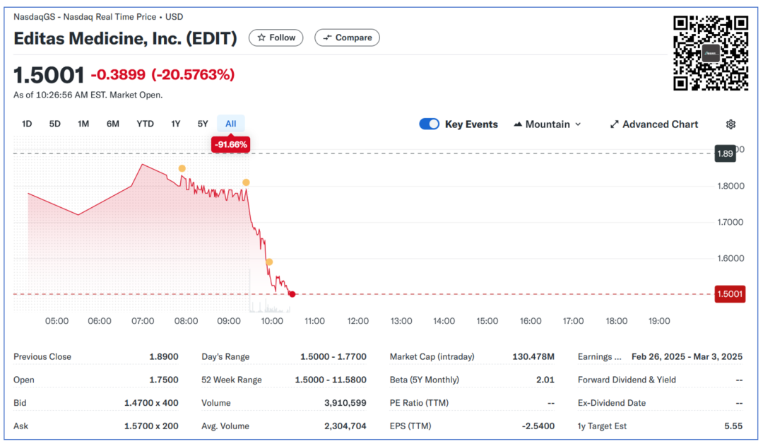 截至成稿时,Editas股价暴跌20%。