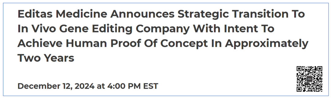 2024年12月12日,基因编辑公司Editas Medicine宣布战略转型(这口气一般没好事)。