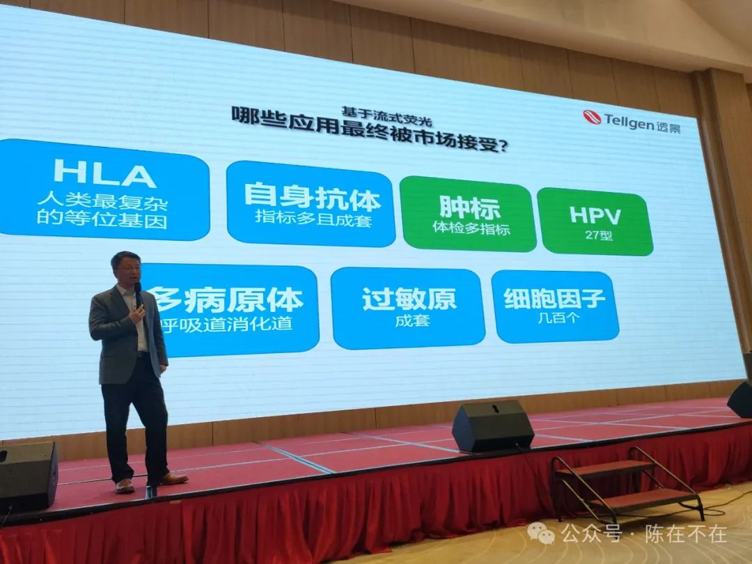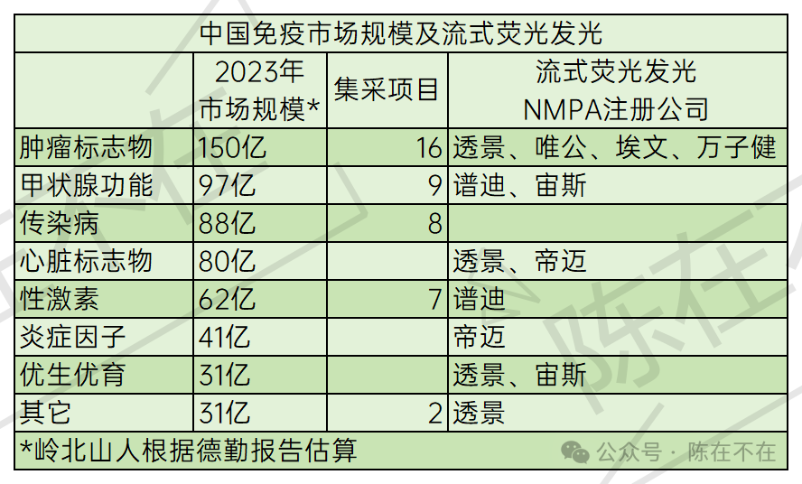 透景董事长姚见儿在第二届临床诊断流式产业大会上的发言 流式荧光发光,由透景生命在临床命名规范化。 1 肿标等传统标志物 透景生命最早从肿标开始,不断深入传统标志物市场,拓展多联检菜单。特别是在体检市场上,其肿标或者相当高的市占率。一个典型表现,就是肿瘤的流式荧光发光也进入了集采市场。 上表的中国2023年免疫诊断市场规模由是岭北山人根据德勤报告测算,笔者同时列出了进入集采的项目数和获得NMPA注册证的流式荧光发光公司。 可以想见,随着集采的深入,项目量大自然雀屏中选,入围价格当然几近腰斩。 控制成本,以及选好品类——有时候小市场也许更美,成为不二之选。 对于流式荧光发光产品,与价格减半的化学发光产品是否还有成本优势,且看市场检验。 2 HPV/呼吸道等分子项目 Luminex采用授权模式,自己继续开发的产品均为分子检测——基于其xTAG技术的呼吸道、消化道病原体项目。 透景生命率先开发了HPV分型试剂盒,一次检测,呈现27种HPV型别。 可以预期,将有更多的分子产品迭代出现。 需要注意的是,流式荧光发光用于分子检测,一般还是需要扩增。 如何设计好引物是最大的挑战——