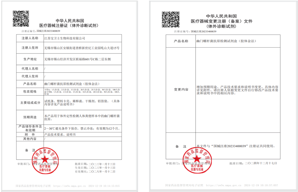 近日,鹍远生物集团子公司—江苏宝卫士生物科技有限公司自主研发的“幽门螺杆菌抗原检测试剂盒”成功取得“居家自测”预期用途的医疗器械变更注册文件(国械注准20233400039)。这是整个集团继大便隐血/转铁蛋白联合检测试剂盒、大便隐血检测试剂盒后的又一款居家自测重磅产品。  据统计,我国幽门螺杆菌人群感染率接近 50%,不同人群感染率在 35.4%-66.4% 之间,且有研究数据显示感染率高达 59%,这意味着大约每两个中国人中就有一人可能感染了幽门螺杆菌[1]。幽门螺杆菌在我国具有家庭聚集性感染的特点,主要通过口-口传播和粪-口传播,如共用餐具、咀嚼喂食、亲吻等方式都可能导至病菌在家庭成员之间传播[2]。对于感染的年龄分布特点为:1)儿童期是高危年龄段,2)感染率随年龄的增长而增加,25 岁人群的感染率接近 50%,35 岁人群感染率 > 60%,70 岁以上的老年人感染率达 80%[3]。幽门螺杆菌检测意义重大。它是诊断胃部疾病前的关键一环,像胃溃疡、十二指肠溃疡、慢性胃炎及胃癌等,都与幽门螺杆菌感染紧密相关。检测能明确病因是否为幽门螺杆菌,判断病情严重程度,评估患癌风险。从治疗角度看,检测结果决定是否需要进行抗菌治疗,治疗后复查还能评估疗效,确保治疗成功。同时,检测可让感染者知晓自身状况,提醒其注意个人卫生,预防病菌在家庭、集体环境中传播。通过检测,能有效防控幽门螺杆菌感染,守护大众胃肠健康[1]。 “居家自测”型幽门螺杆菌抗原检测试剂盒的上市,可以有效满足“居家”预防、监测、管理的场景,让每个人有望成为“抗幽门”的专家和自己的“家庭医生”。参考文献: [1] 中国疾病预防控制中心传染病预防控制所. 中国幽门螺杆菌感染防控白皮书[M]. 北京, 2023: 1-47. [2] 丁松泽,杜奕奇,陆红,等.中国居民家庭幽门螺杆菌感染的防控和管理专家共识(2021年)[J].胃肠病学,2022,27(12):734-746. [3] 中华医学会, 中华医学会杂志社, 中华医学会全科医学分会等. 幽门螺杆菌感染基层诊疗指南(2019年)[J]. 中华全科医师杂志, 2020,19(05) : 397-402.