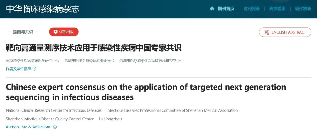 前言 感染性疾病仍是全球主要的公共卫生威胁之一,及时准确的病原学检测对于感染性疾病的诊治至关重要。传统的病原体检测方法,如涂片镜检法、培养法、免疫学方法和分子生物学技术等,在临床检测中发挥着各自优势,但也存在不同的局限性。随着测序技术和平台的不断进步,靶向高通量测序技术(targeted next generation sequencing,tNGS)在感染性疾病病原体检测中展现出显著的潜力和优势,其应用领域也将更加广泛。 为保证tNGS在临床应用更加规范,提高tNGS技术应用于感染性疾病病原体诊断的质量,明确tNGS应用场景,有效实施质量管理,由国家感染性疾病临床医学研究中心主任卢洪洲牵头,联合全国41家医院感染、检验、微生物、危重症方向近60名权威专家共同参与的《靶向高通量测序技术应用于感染性疾病中国专家共识》(以下简称《共识》)于2024年12月在《中华临床感染病杂志》出版。 《共识》于2024年年初启动,9月于国家感染性疾病临床医学研究中心2024年年会暨第十五届结核病东方论坛正式发布。《共识》汇集多方智慧,采用2011版牛津大学循证医学证据分级与推荐意见强度分级方法,对循证医学证据等级和推荐意见强度进行了评估,旨在为tNGS技术在临床抗感染诊治能力等方面提供专业的指导和建议,助推精准医疗和全球健康管理的进步。 从左至右依次为:中山大学附属第五医院感染科主任丁立、山东省公共卫生临床中心副院长汤伟、国家感染性疾病临床医学研究中心主任/深圳市第三人民医院院长卢洪洲、华大基因CEO赵立见、香港大学公共卫生病毒学系潘烈文、深圳市第三人民医院感染科主任袁静 tNGS临床送检指导建议 感染性疾病的病原体类型复杂,如病毒、细菌、真菌、其他非典型病原体或混合感染等。而感染传统培养阳性率较低,未及时治疗,可能会导至更为严重的并发症,特别是老年人、年幼儿童、肥胖者、孕产妇和有慢性基础疾病者等高危人群较易发展为重症病例,应当给予高度重视,尽早明确病因,给予对应的药物治疗,降低重症风险[1,2]。《共识》针对疑似呼吸道系统、血流系统、中枢系统、泌尿系统、脊柱关节等感染情况,给出了明确的tNGS送检指导意见。 建议1 对于以下疑似下呼吸道感染的非重症患者,建议进行tNGS检测: (1) 传统微生物检测尚未明确病原体; (2) 经验性抗感染治疗2~3 d效果不佳; (3) 高危人群包括儿童、老年人、孕妇、肥胖、存在基础疾病等(B2b)。 建议2 对于以下疑似中枢神经系统感染的非重症患者,建议进行tNGS检测: (1) 经验性抗感染治疗2~3 d效果不佳; (2) 传统微生物检测结果阴性的脑膜炎、脑脊髓膜炎、脑炎和疑似颅内感染占位性病变; (3) 新生儿(B2b)。 建议3 对于以下疑似血流感染(bloodstream infection,BSI) 的非重症患者,建议进行tNGS检测: (1) 传统微生物检测结果阴性; (2) 经验性抗感染治疗2~3 d效果不佳; (3) 儿童、孕妇、老年人、存在基础疾病的高危人群(B2c)。 建议4 对于以下疑似泌尿系统、脊柱关节感染的患者,建议进行tNGS检测: (1) 传统微生物检测结果阴性; (2) 经验型抗感染治疗2~3d效果不佳(B2b)。 区分tNGS及mNGS的 临床送检场景和优劣势 社区性感染暴发应采取准确、快速、全面的方法以尽快明确病原体,医院感染管理科、疾病预防控制中心等部门方可根据病原体采取有效的防控措施。tNGS针对的是已知的、临床常见的病原体,因此对于新发病原体,该方法很有可能会发生漏检,此时mNGS具有病原体覆盖更广的优势,共识明确区分了mNGS和tNGS的送检场景和优缺点[3,4]。 建议6 对于以下感染情况,优先考虑mNGS送检: (1) 传统方法检测病原体尚未明确且病因不明的危重症患者; (2) 病因不明的免疫功能缺陷或抑制患者; (3) 社区聚集疑似新发病原体暴发流行的病例(B2b)。 tNGS样本采集送检规范 《共识》指出样本采集环节建议在使用抗菌药物治疗之前,如果患者已经使用抗菌药物治疗,应在下一次用药之前进行采集。样本的选择须结合患者自身情况、流行病学、病原体特性、受累器官及感染部位等状况综合考虑,共识强调了样本采集保存和运输规范。怀疑上呼吸道感染时,可选择鼻咽拭子/口咽拭子;怀疑下呼吸道感染,尽可能采集BALF进行检测,提高检测结果的准确性。 tNGS检测及数据分析 基于不同技术的tNGS具有各自的独特优势,基于探针捕获技术的tNGS (hybrid capture-based tNGS,hc-tNGS) 通过设计特异性探针捕获目标病原体的核酸序列,可以显著提高对目标病原体检测的序列数和覆盖度,可检测几百到几千个靶标[5];基于多重PCR技术的tNGS (multiplex PCR-based tNGS,mp-tNGS)通过设计多重PCR引物对目标病原体的核酸进行富集,实验步骤相对简单快捷,几个小时就能完成建库和测序流程,适用于检测几十到几百个靶标[6]。 建议10 对于基于探针捕获技术或者多重PCR技术的tNGS技术各有优缺点,实验室需要根据具体的临床需求、适用场景、样本类型、预期的病原体种类和数量、实验室的设备和技术水平等因素进行综合考虑选择(C4)。 测序数据量直接关系到tNGS应用于感染性疾病病原体诊断的灵敏度和特异度。较高的数据量可以提高低丰度病原体的检出率,并且有助于区分真正的病原体序列与背景噪音,减少假阳性和假阴性结果,从而提高诊断的准确性[7,8] 。 随着科技的进步和医学诊断需求的提升,医院内部检测能够显著缩短样本处理和结果报告的时间,有