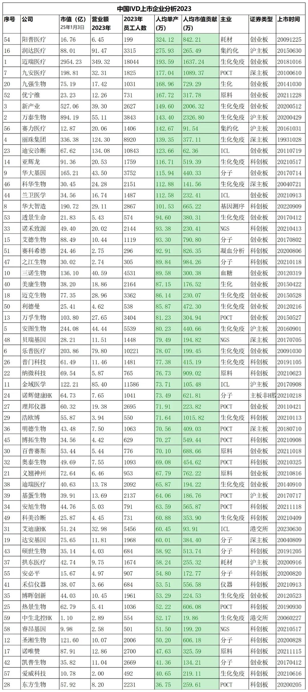 营收过百亿,靠IVD业务有多难? 目前营收过百亿的三家企业,各有所长,迈瑞医疗2023年营收达到了349亿,其中体外诊断业务实现营收124.21亿元,同比增长21.12%,占比总营收35.56%,其中国际体外诊断业务连续两年的复合增速超过了30%。迪安诊断则是因为实验室打包和共建提升了大量的业务流水,基本一家实验室的流水就是千万级的;而丽珠集团则主要依靠化学制剂,诊断业务的营收大概在10亿左右的规模。 人均业务贡献>100万,仅16家企业 我们统计了IVD相关上市企业2023年的业务营收和员工人数,用总营收除以人数,得到了人均单产,其中人均单产最高的企业为阳普医疗和润达医疗,人均单产分别为324万和275万,业内最高!第三个是迈瑞医疗,人均单产为193万,九安医疗177万,九强生物168万。 如果拿人均单产来核算公司的营运情况,100万/人,这个参数可以作为一个基本参考线,如果是追求卓越或者头部公司可以参考迈瑞200万/人的这个标准。 如何提高人均单产和业绩贡献呢? 人均单产低,意味着企业利润率相对就会较差,组织效率就会较低,因此企业应该多关注这个指数,发挥个人的潜力,提升组织效率。 当然直销和经销模式的不同,人均单产也会不同,一般直销客户人均单产会低一些,因为本身的利润空间大,所以人均单产低也能保证企业的盈利能力,如果是经销模式,则人均单产就会高一些,因此上表的数据大家看的时候需要注意区分。 |