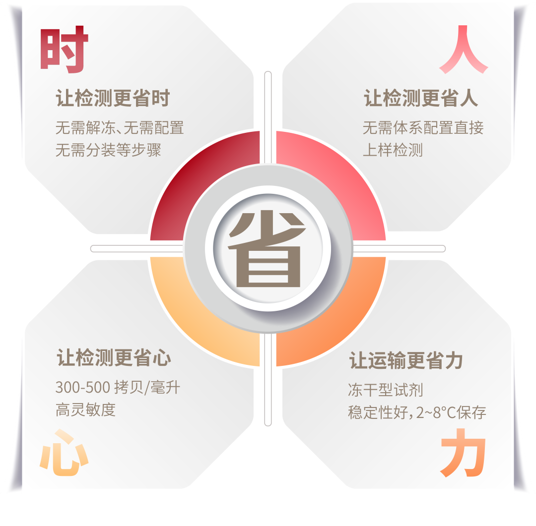 灵敏准确:检测限达300-500 拷贝/毫升,有效防止漏检;操作简单:预分装冻干微球技术,无需分装试剂,加入核酸即可检测,省人省力防污染;甲型流感病毒、乙型流感病毒、呼吸道合胞病毒、鼻病毒、腺病毒、新型冠状病毒快速检测6种常见呼吸道病毒,识别早期病毒感染,进行早期治疗; 精准鉴别新冠、流感和普通感冒,有助于及时进行分流管理和针对性治疗;提供临床指导,准确甄别6种呼吸道病毒,有助于进行精准治疗老年科/血液科/移植科/肿瘤科; 重症监护; 急诊、发热门诊