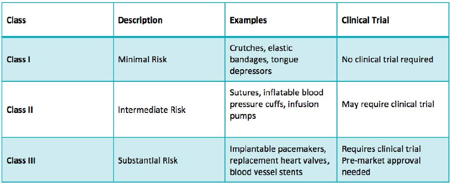 比方说可穿戴产品中,有收集人体血压、心率、血糖等指标,是医疗器械;如果只是帮你计算运动量、打电话、播放 MP3,则不属于医疗器械。对于辅助疾病管理的 APP 和软件,如果只是储存和处理输入的数据(非直接从人体或人体样本获得),不属于医疗器械;但如果处理的数据直接来自于人体或人体样本,则是医疗器械。对于某些间接收集的数据,如果参与诊断过程也会被视为医疗器械,比如一些公司的 CT/PET 数据处理工作站,但如果只是存储备份传输就不算。 国家对医疗器械按照风险程度实行分类管理:第一类是指风险程度低,实行常规管理可以保证其安全、有效的医疗器械;第二类是指具有中度风险,需要严格管理以保证其安全、有效的医疗器械;第三类是指具有较高风险,需要采取特别措施严格控制管理以保证其安全、有效的医疗器械。 根据 2014 年 10 月 1 日生效的《医疗器械注册管理办法》(国家食品药品监督管理总局局令第 4 号),第一类医疗器械实行备案管理,第二类、第三类医疗器械实行注册管理。通常来说,第三类医疗器械由于风险较高,经常需要临床试验的数据来支持注册;第一类较简单,备案即可;第二类医疗器械,根据《医疗器械临床评价技术指导原则 (征求意见稿)》,需要收集相关的数据对产品进行论证。如果现有数据就能明确证明产品的有效性和安全性,可以不必做临床试验,反之则需要临床试验的数据来支持产品的有效性和安全性。 评估海外市场潜力 对于医疗器械风险程度的评价,主要考虑医疗器械的预期目的、结构特征、使用方法等因素。美国 FDA 采取类似的风险评估和管理方法,如下图: