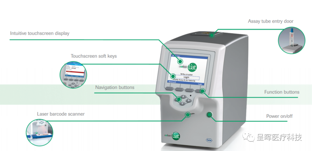 Cobas®Liat®分析仪是具备创新功能的PCR分子诊断POCT平台。分析仪采用硬件按钮和触控板相结合的方式进行控制,测试管同时作为拭子的保存管,从分析仪的顶部插口放入,仅能装载一个样本。