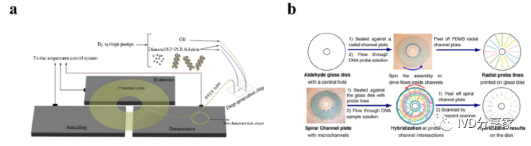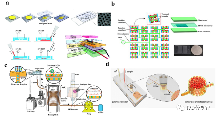 在现有的一些ddPCR系统中,液滴发生器产生液滴后,需要将液滴转移到其他模块进行扩增和检测,可能会导至转移过程中液滴丢失,结果不准确。在转移过程中存在交叉污染的风险。如张等人采用喷墨打印技术,在油相中产生单分散液滴,然后稳定分散到毛细管中,简化了乳化过程,大大减少了试剂的损失,且生成的液滴在不同温度下是连续的。该方法应用于携带目标DNA的阳性液滴,并利用该系统对三个数量级不同数量的DNA进行定量评估。Wei等人开发了一种新型 dPCR 芯片,它将液滴产生、液滴阵列自组装、PCR 扩增和荧光检测集成到一个设备中。它的特点是制造成本极低、定量能力强且有小型化的潜力,满足DNA分子定量标准。