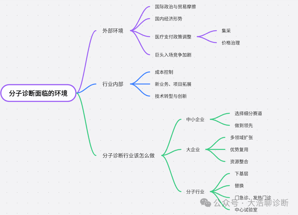 大浩最近频繁和业内同行、同事、渠道、终端的老师进行交流,愈发认为2025年将会是分子诊断的分水岭之年,若企业能在此时期存活下来就会存在,若被无法生存就会被彻底淘汰。为何大浩会做出如此“暴论”本篇就从内因,外因两个维度来阐述。并根据大浩理解给出分子诊断企业该如何应对的建议。2025年1月16日,美国商务部工业与安全局 (BIS) 在联邦公报中发布了新规则,未经美国许可,任何公司和个人均被禁止向中国及其他国家出口特定类别的流式细胞仪和质谱仪。后有建国同志挥舞关税大棒和威胁论,二进白宫,不知未来是否会对于分子诊断的进口和外贸有所影响。当然这都取决于建国同志,还想不想让米国老百姓过上正常生活。2025年1月18日国家统计局发布2024年四季度和全年国内生产总值初步核算结果。结果显示我国2024年GDP较2023年增长5%。实际的国内经济环境增速,不代表细分的医疗行业环境,具体情况这里不过多赘述。随着竞争加剧,价格屡破新低争夺存量市场这并不异常。集采:化学发光之后按照价格计算直接少了一半市场。导至国内国际大型企业开始降本增效。目前分子诊断仅HPV项目(还是几个分型或不分型产品)被集采,倘若分子诊断产品迎接大规模集采,呼吸道,生殖道产品被集采价格又会迎来新一轮调整。价格治理:北京时间2024年11月23日,国家医保局的直播中提出,尽快形成全国统一标准的医疗服务价格话语体系。加上2024年底的两轮价格治理。目的为了治理,各地区之间采购成本和政府指导价格差异大的现状。通过价格治理,既降低医保支付压力,又同时形成统一的价格体系。若分子诊断迎来统一的价格治理形成新的价格体系,终端检测价格或许会继续下调。所以大浩认为无论是集采还是价格治理,本质上都是为医疗体系和人民群众减负。但不同是集采是从购买源头降低医保支出,而价格治理是从输出端降低医保支出和人民看病支出。从多家大型上市ivd企业的年度财报来看,更多上市企业开始规划分子诊断仪器与试剂并且有望在2025年迎来产品集体准入上市。大型企业的终端关系和渠道路径,会帮助其快速进入市场,梳理通顺决策链。同时大型企业还会以原材料自产和规模效应进一步降低成本。若此分子诊断竞争加剧,行业洗牌加速,马太效应越加明显。由于大企业进场加剧市场竞争,政策端调整,致使企业降价竞争成为常态,此时成本控制就成为重中之重。成本控制包括优化产品、努力增加市场份额获取更低的原材料价格。此外人员端的降本增效也成为近两年被提及最多的话题。新业务模式包括,之前文章提出的将医院纳入居家送检体系居家送检的挑战与未来,通过合理合规合法的方式提升医院收入,加深与医院之间的合作和绑定。或者例如生殖道项目和高端体检中心合作,和私人妇产医院及民营医院合作。诊疗一体化,药企与诊断企业联动。目前最合适分子诊断的呼吸道成为红海市场已成定局,下一步看更多适用场景和对应人群以及疾病。分子诊断可开拓的新领域包括:最近SS包揽数证的药物基因检测。此外大浩认为下一个感染风口的生殖道感染(上/下生殖道),以及最近被CDC频繁提及以诺如病毒为代表的其他性腹泻的多联检。(金葡、大肠、志贺、沙门等细菌,以及A群、轮状、肠腺等病毒)。可以预测随着更多分子诊断项目的开展,对于复杂样本的前处理和需求量会增加。微创新是近期被频繁提及,虽然微创新的产出未必会有革命性新技术,有如此高的产出,但其通过低成本低投入,获得相对收益的同时解决实用性问题。例如快速PCR前的超声破碎破碎仪,例如样本消化液、又例如可以处理各种样本类型的样本前处理模块,这些都是微创新的代表。革命性新技术是必须要投入,毕竟科技是第一生产力,但要考虑清楚新技术到底是解决什么问题的。选择细分赛道,做到细分赛道领头,中小企业无论是成本还是人员数量都无法和大型企业相提并论,所以需要创始人和高层选对赛道,深耕细分行业,争取做到细分赛道领头。既然需要到细分赛道领头,那么建立产品壁垒与特点必不可少,是细分产品丰富还是有独家产品,亦或通过技术创新解决目前无法解决的问题。大企业大浩没有任职过,但是可以参考目前分子大型企业在做什么。横向扩张:例如涉足发光、测序、质谱等IVD平台。或者涉足肿瘤检测、血液筛查检测等。纵向扩张:例如涉足上游原材料、元器件制造、下游ICL等。由于政策到临时间的不确定性,对于大型企业来说有着成熟的优势复用就很重要。例如渠道优势,入院优势的复用,又例如报证路径的复用(例如联检分单检、不同单检交叉组合),以应对政策变动就显得很重要参考DA和SS。企业多部门甚至是多子公司之间的资源整合和协同也显得尤为关键。支持分子诊断下基层,形成分级诊断:央视新闻中国家卫生健康委基层卫生健康司司长傅卫表示:习近平总书记要求,要看大病在本省解决,一般的病在市县解决,日常的头疼脑热在乡村解决。对于日常的头疼脑热在乡村解决,以及2024年6月3日医政司发布《关于进一步深化改革促进乡村医疗卫生体系健康发展的意见》。第五点利用信息化手段连通各级医疗机构中提到,积极开展医学影像、心电、病理诊断等远程医疗服务推广“基层检测”,“上级诊断”。这些政策都支持分子诊断下基层,为分级诊断