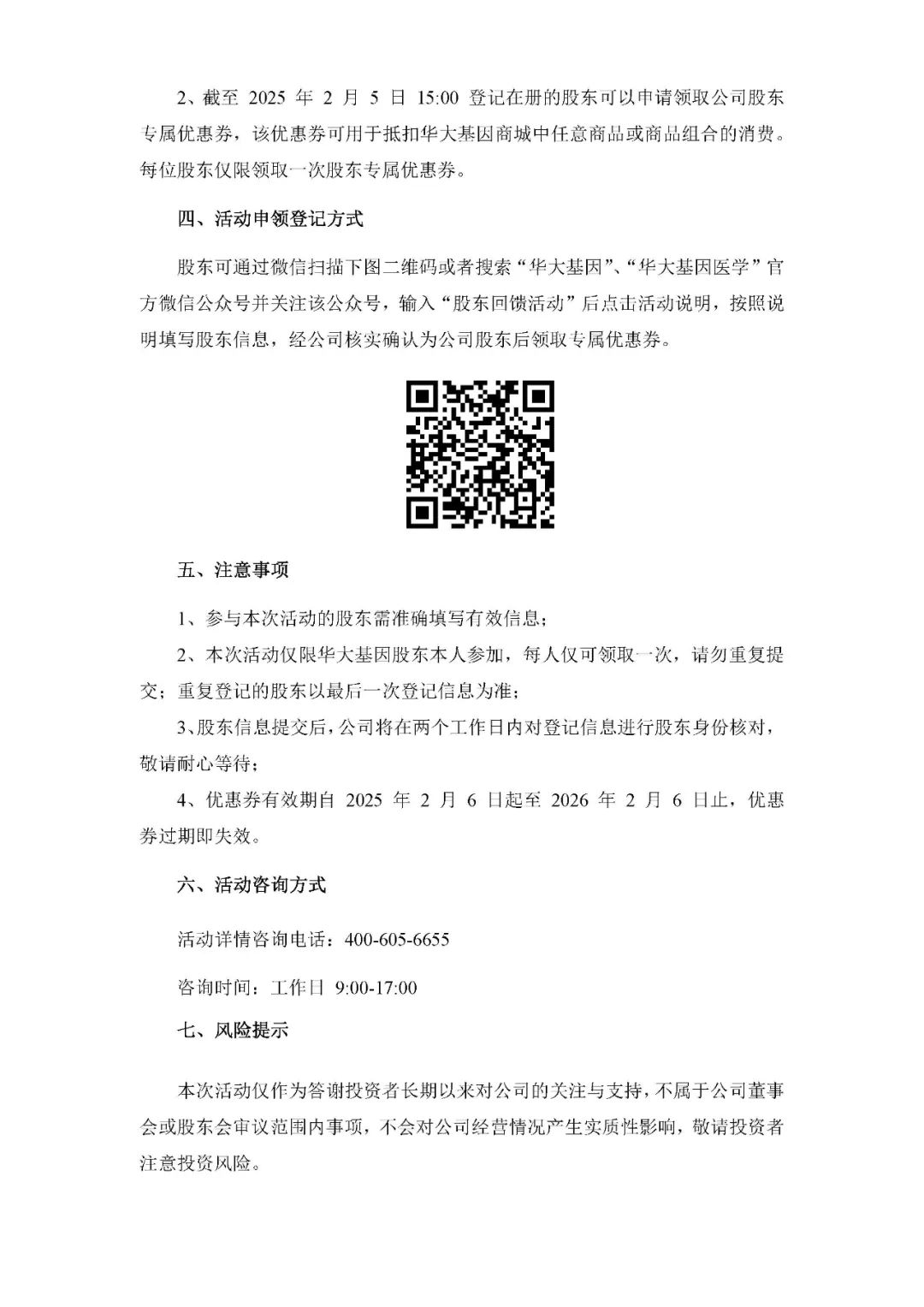 截至2025年2月5日15:00登记在册的股东可以申请领取公司股东专属优惠券,该优惠券可用于抵扣华大基因商城中任意商品或商品组合的消费。每位股东仅限领取一次股东专属优惠券。