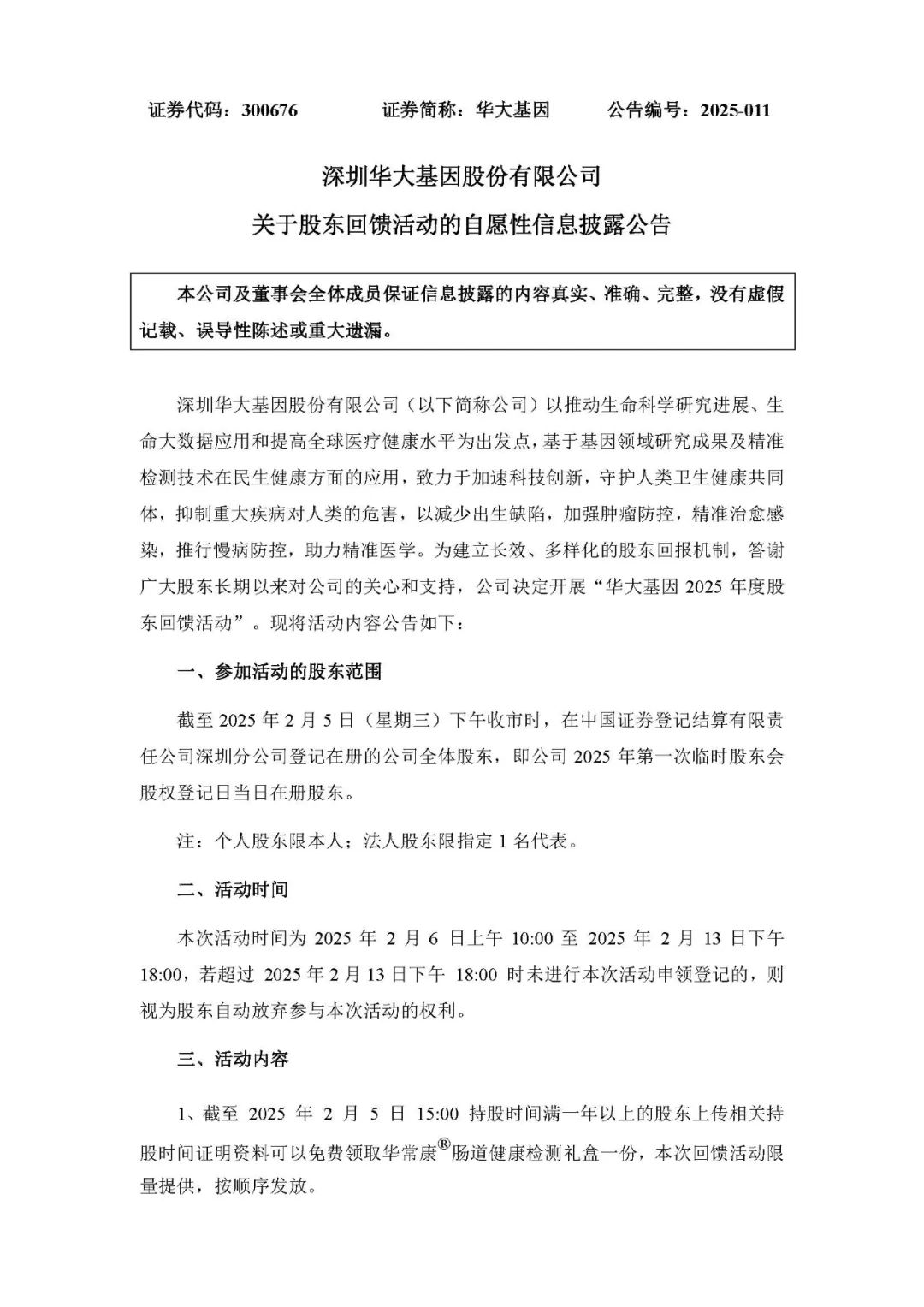 2月5日华大基因发布公告,公司决定开展“华大基因2025年度股东回馈活动”。