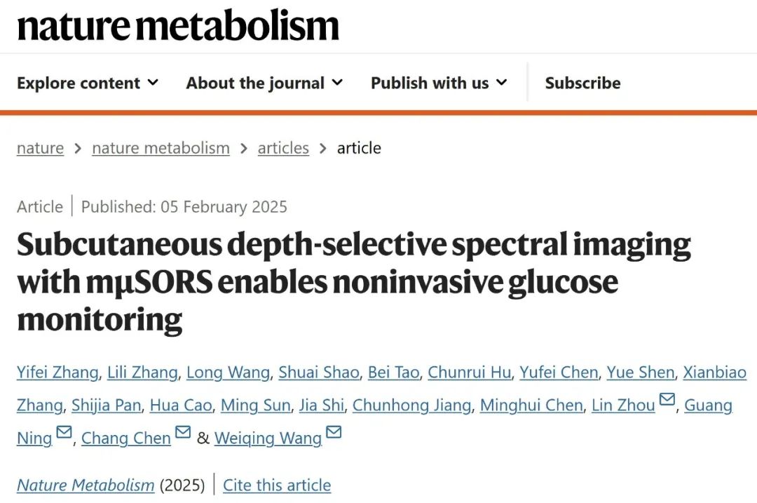 2025 年 2 月 5 日,上海交通大学医学院附属瑞金医院国家内分泌代谢病临床研究中心王卫庆教授团队,携手瑞金医院医学芯片研究所及上海近观科技的陈昌研究员团队,于《自然代谢》(Nature Metabolism)在线发表了一篇题为 “Subcutaneous depth-selective spectral imaging with mμSORS enables non-invasive glucose monitoring” 的研究论文。该研究成果意义非凡,有望助力广大糖尿病患者摆脱扎手指或抽血测血糖等传统有创检测方式的困扰。 在此次研究中,团队另辟蹊径,开创性地提出了一种名为多重微空间偏移拉曼散射(mμSORS)光谱技术的无创血糖检测方法。患者只需将手掌轻轻贴在检测设备上,就能准确测量血糖水平,有效规避了有创检测带来的疼痛和感染风险。研究过程中,团队先借助光学相干断层扫描(OCT)技术,确定了人体大鱼际表皮厚度的分布范围,进而针对性地研发出 mμSORS 无创血糖检测技术。这项基于多重拉曼光谱成像的新技术,不仅能实现皮下不同深度的高空间分辨率同步探测,还能有效降低表皮的背景信号干扰,显著提高血糖检测的信噪比。在第一阶段的系统性探索研究中,团队明确了无创血糖检测的最佳探测深度位于富含携带血糖信息的组织液和毛细血管的真皮 - 表皮交界处(DEJ)或其下方,并且证实 mμSORS 能够以完全无创的方式有效采集到人体血糖相关的拉曼光谱信号,在解析算法中发现提取出的主要因子的光谱与葡萄糖的拉曼光谱高度一致。 为了进一步验证该无创血糖检测技术的准确性和通用性,在第二阶段,研究团队针对 200 例糖尿病患者和 30 位正常健康人群开展了临床研究,收集了 30 多万套由金标准静脉血血糖值标定的 mμSORS 光谱数据集,并进行了血糖预测模型建模及分析。结果表明,mμSORS 无创血糖检测值与静脉血血糖值之间绝对误差的平均值 MARD 为 14.6%,无创血糖检测值落在共识误差网格临床可接受区 CEG(A+B)的占比高达 99.4%。值得强调的是,这项技术无需个体校准,适用于不同年龄、肤色和肥胖程度的人群,为未来大规模应用奠定了良好的通用性基础。 上海交通大学医学院附属瑞金医院国家内分泌代谢病临床研究中心主任王卫庆教授为论文最后通讯作者,瑞金医院医学芯片研究所所长陈昌研究员及近观科技的周琳博士为共同通讯作者,瑞金医院的张翼飞主任医师、汪龙主治医师和近观科技的张莉丽博士、邵帅博士为论文共同第一作者。本项目得到了国家重大专项、上海市科委、瑞金医院广慈高能计划等资助。 |