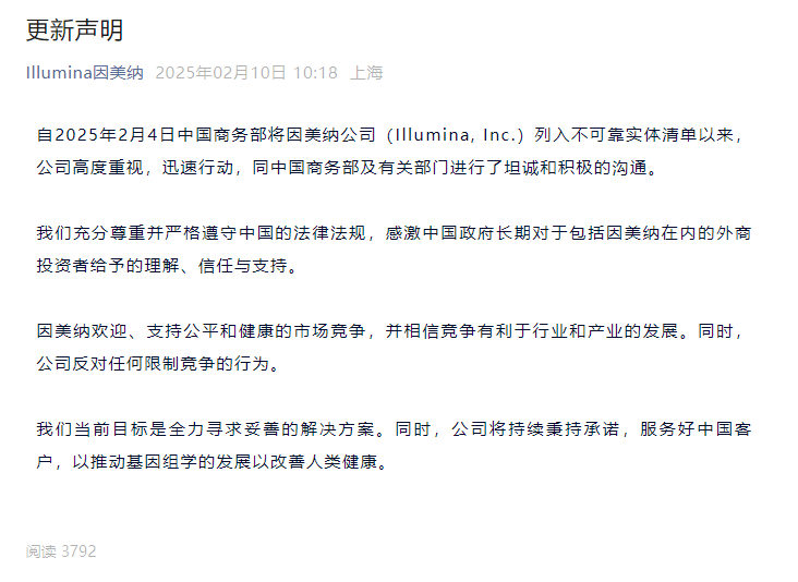 自2025年2月4日中国商务部将因美纳公司(Illumina, Inc.)列入不可靠实体清单以来,公司高度重视,迅速行动,同中国商务部及有关部门进行了坦诚和积极的沟通。我们充分尊重并严格遵守中国的法律法规,感激中国政府长期对于包括因美纳在内的外商投资者给予的理解、信任与支持。因美纳欢迎、支持公平和健康的市场竞争,并相信竞争有利于行业和产业的发展。同时,公司反对任何限制竞争的行为。我们当前目标是全力寻求妥善的解决方案。同时,公司将持续秉持承诺,服务好中国客户,以推动基因组学的发展以改善人类健康。