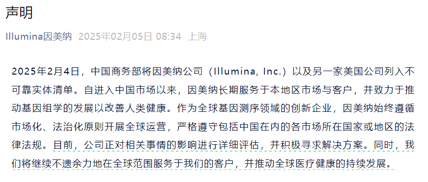 | 2025年新春伊始,一则重磅消息在业界引发震动。2月4日,中国商务部首次将全球最大的基因测序公司——因美纳(Illumina, Inc.)——列入了不可靠实体清单。这一事件距离因美纳测序仪首次在中国获批上市,不足7年。2月7日(昨天),华大智造等中国测序厂商,顺势推出了全通量测序平台置换方案。而因美纳与华大这两个“老对手”在全球市场的竞争博弈已持续了15年之久。表面上,这是中美之间日趋白热化的市场竞争环境,投射在基因测序这个子行业上激起的巨大波浪。另一方面,基因测序巨头们在15年时间里博弈持续升级:因美纳和华大智造为代表的国产测序企业们,从战略并购到价格战、专利诉讼战,都主动或被动被裹挟到成为中美大国竞争的桥头堡。对于竞争者、合作方等利益相关方,最大的风险在哪里?未来又谁主沉浮?2月5日,因美纳发表声明表示,将积极寻求解决方案: