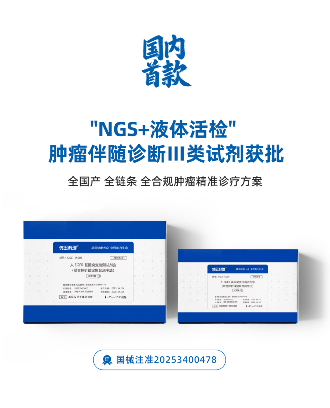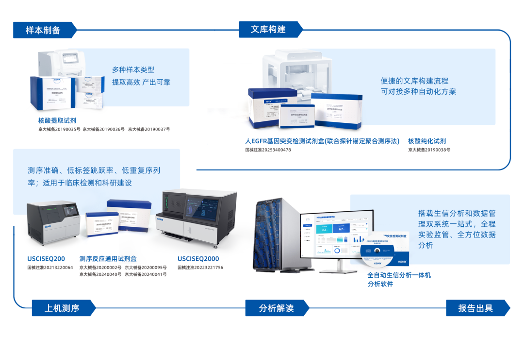 优迅医学拥有覆盖生育健康、肿瘤精准诊疗和病原检测三大领域的产品矩阵,围绕USCISEQ高性能测序平台,开发了从样本制备到上机检测的完善配套试剂体系。 其中针对肿瘤液体活检的伴随诊断试剂盒——人EGFR基因突变检测试剂盒(联合探针锚定聚合测序法)已获NMPA审批上市(注册证编号:国械注准20253400478)。灵敏度高、特异性强,可搭载于优迅医学自主测序平台USCISEQ系列产品,填补了NGS技术在肿瘤液体活检精准诊疗这一重要应用场景的市场空白,可为临床提供全流程合规的国产化肿瘤精准诊疗院内解决方案。