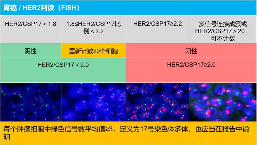 当前胃癌在用三套指南,第一套为2011年的《胃癌HER2检测指南》,当中提到了胃癌HER2 FISH检测阈值与相关质控内容,也是目前胃癌HER2 FISH检测在用阈值。第二套指南在2016年进行更新,对于胃癌的IHC和FISH HER2检测进行进一步补充,并提出胃镜活检样本HER2检测必要性和检测规范为第三套胃癌胃镜活检标本HER2检测共识进行了铺垫;第三套《胃癌胃镜活检标本HER2检测共识》则是倾向于胃癌胃镜活检标本检测HER2,对检测内容,检测前样本要求,检测中流程质控和检测后报告发放都提出了专家建议,进一步完善胃癌HER2检测流程,实现HER2检测规范化标准化。