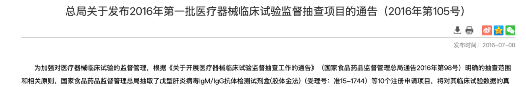 PS:这篇仅代表个人观点。如果我俩理解不一样,那么你是对的。欢迎留言区探讨。 “真实性问题、严重不符合要求问题、规范性问题、符合要求”对于“真实性问题”和“严重不符合要求问题”,都明确了处罚措施:“10年内禁止申请”这一尘封在《医疗器械监督管理条例》第八十三条里的处罚措施,被首次明确的摆上了台面。因为之前不管是《食品药品监管总局关于开展医疗器械临床试验监督抽查工作的通告》(2016年第98号),还是《国家药监局综合司关于印发医疗器械临床试验检查要点及判定原则的通知》(药监综械注〔2018〕45号),都并未明确把这一条写进处罚措施里。而至今有记录的最重处罚结果也只是“不予注册+1年内不得再次申请该行政许可”。此次发布的公告曾经在2023年11月和2024年6月两次公开征求意见。有两个征求意见稿中的“真实性问题”被降级为“严重不符合要求问题”1. 修改受试者信息、样本及试验医疗器械信息、主要试验过程记录、研究数据及检测数据等临床试验数据,严重影响安全性有效性评价;2. 入选排除标准、主要评价指标、重要的安全性指标等关键临床试验活动、临床试验数据或者样本不能溯源在当前合规趋严的环境下,如果一家企业十年内无法进行产品注册,这就是“死刑”。——以“少数极刑”换取“多数老实”,这中间的杠杆越大,说明执行效果越好。这可能也是那两条被“降级”为“严重不符合要求问题”的考量因素。而随着范围被缩窄、目标可锁定,处罚的落地执行就变得可预期了起来。谁会成为第一家“10年内不受理相关责任人以及单位提出的医疗器械许可申请”的IVD企业?从历史来看,药监局会给予企业“主动认错”的时间窗口。2016年6月8日,药监局发布《食品药品监管总局关于开展医疗器械临床试验监督抽查工作的通告》(2016年第98号)。6月8日-8月25日,51家企业主动撤回了101个医疗器械注册申请项目;4个项目被“不予注册”且“不予注册之日起一年内不予再次受理”。于是在8月26日-10月19日,又有44家企业撤回了130个医疗器械注册申请项目。当然,上一次的“紧急避险”只需撤回注册申请,而这一次涉及到“撤回注册证”,可能决策起来就有点肉痛了。不管是12315或者在线信访这样的NMPA公开渠道,还是内部联系注册管理司/审核查验中心这样的非公开渠道——毕竟,“造假拿证”算是行业公敌了,而友商也乐于见到这样的企业被十年禁入。