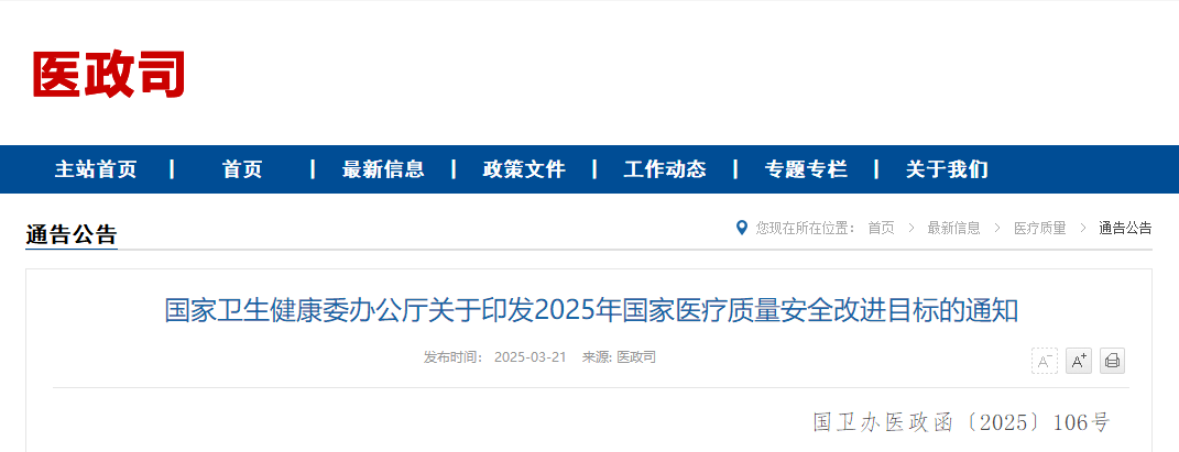 3月21日,国家卫生健康委办公厅发布《2025年国家医疗质量安全改进目标》和各专业2025年质控工作改进目标。优化改进工作策略,创新工作机制和方式方法,深入推进目标管理,实现医疗质量安全持续改进。