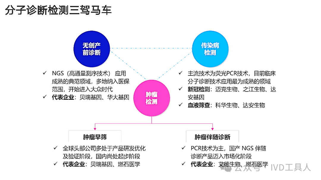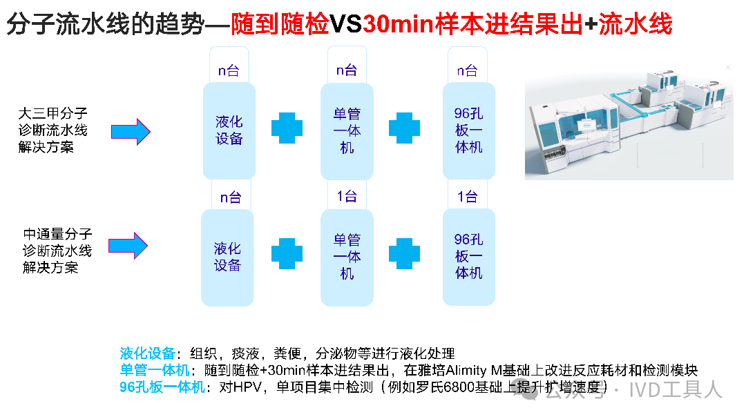 作者:雷总 在分子诊断领域,严肃医疗与消费医疗正展开激烈竞争,各方纷纷推出创新产品以抢占不同应用场景下的客户资源。 分子诊断流水线以其高通量和自动化程度,适用于大型医院检验科、血站等严肃医疗场景。例如,徕伯益的NAT8000核酸检测流水线,可实现24小时≥8000管的检测通量,通过5个独立分区的协作,完成从试剂准备到结果判读的全过程自动化,有效提升了检测效率和准确性。 分子诊断一体机则以其灵活性和高效性,受到中等规模样本量检测场景的青睐。如罗氏的Cobas 6800/8800系统,具备样本供应、转移、制备及扩增检测的全流程自动化能力,3.5小时内可完成96个检测结果,满足了严肃医疗中对快速、准确检测的需求。 分子诊断POCT以其便携性和快速检测能力,成为基层医疗机构、医院门急诊、床旁诊断等消费医疗场景的有力竞争者。例如,鲲鹏基因的iFIND全自动核酸检测系统,将多种技术集成为一体,实现了Sample in Result out的全流程自动化,1小时内便可出具结果并打印报告,极大地方便了消费医疗场景下的快速诊断需求。 互联网+分子诊断则通过便捷的线上服务和远程诊断功能,拓展了分子诊断的应用场景。它使得患者能够在家中或偏远地区进行样本采集,并通过互联网将数据传输至专业实验室进行分析,结果可通过线上平台及时反馈给患者或医生,这种模式特别适合于慢性病管理、远程医疗等消费医疗场景。 分子诊断流水线、一体机、POCT以及互联网+分子诊断各自凭借独特的优势,在严肃医疗与消费医疗的不同场景中争夺客户,推动着分子诊断技术的不断发展与应用。 |