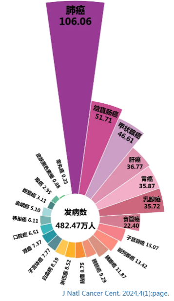 肺癌是我国发病率、死亡率双高的 “癌症头号杀手”,2022年,全球有248万人新患肺癌,其中,中国的新发病人数就高达106万(数据来源:《Cancer incidence and mortality in China,2022》)。占据了全球新发病例的近一半。更为触目惊心的是,73.3万的中国患者因肺癌离世。