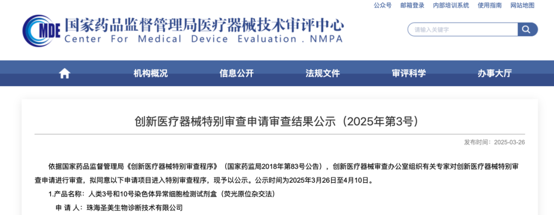 2025年3月26日,国家药品监督管理局医疗器械技术审评中心发布《创新医疗器械特别审查申请审查结果公示(2025 年第 3 号)》,珠海圣美生物诊断技术有限公司自主研发的“人类3号和10号染色体异常细胞检测试剂盒(荧光原位杂交法)”进入创新审查通道。作为国内首款通过荧光原位杂交(FISH)技术检测外周血染色体循环异常细胞(CAC)的肿瘤液态活检产品,该试剂盒填补了肺结节人群极早期肺癌辅助诊断的空白,标志着我国在早期肺癌精准医疗领域从 “跟跑” 迈向 “领跑”。