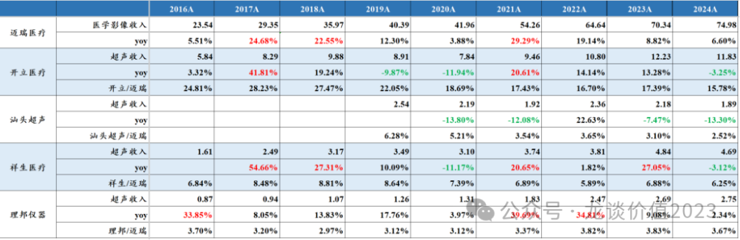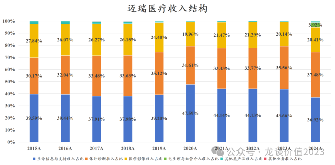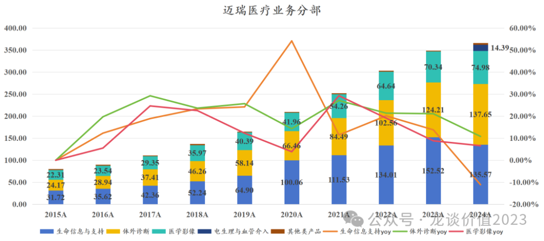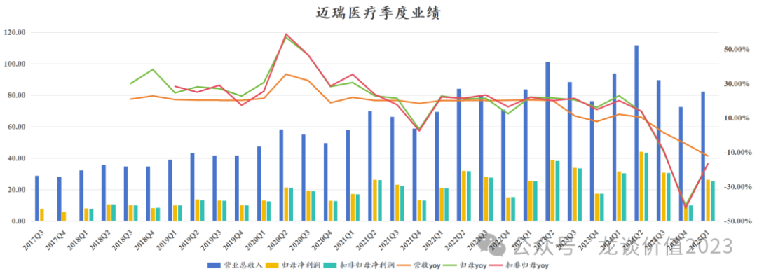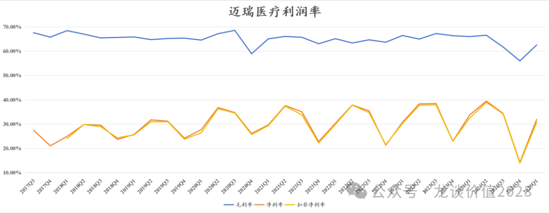 今年以来几乎每篇文章留言都会有读者问到迈瑞的情况,我也多次回答过这个问题,就是至少要等到年报和一季报后再看,迈瑞医疗在上周发布了24年的年报和25年的一季报,我们也如期来聊聊迈瑞医疗的情况。 众所周知迈瑞医疗会对季度间和年度的业绩做平滑,从2020年的四季度到2023年的2季度,迈瑞医疗连续11个季度的收入增速维持在20%左右,也就是上图中橙色曲线几乎完全横在20%附近的那段时间,直到2023年下半年医疗反腐对整个医疗设备采购带来较大冲击后,迈瑞医疗的收入端开始呈现压力,无法再稳定在20%左右的增长,收入增速开始逐渐往下掉,迈瑞医疗2021-2023H1的收入增速都调整在20%出头,而2023年全年收入增速掉到15%,2024年进一步掉到5%。 如果从上半年和下半年来做划分,按照我们看医疗设备的经验来说,行业长期的普遍规律是下半年会高于上半年、四季度会是全年设备采购和收入确认的高点,而迈瑞医疗近几年不论是基于业绩调控的因素还是基于政策面的影响,下半年收入始终低于上半年。 迈瑞医疗2024年下半年的收入是162亿元同比-1.6%、环比-21.1%,2023下半年的收入是165亿元同比+9.6%、环比-11%,23年下半年本身就是医疗反腐影响下的一个低基数,24H2则是进一步下滑,公司应该是在24年下半年以来进行了渠道库存的消化,这也是行业普遍进行的,其他可比的设备公司也都有类似的趋势。 利润端,迈瑞医疗同样会进行季度间的平滑,过去几年利润率始终维持在稳中有升,2019-2023年的净利率分别是28.3%、31.7%、31.7%、33.2%。迈瑞对利润端的调控能力还要强于收入端,直到2023年迈瑞医疗依然维持了20%出头的归母净利润增速。 但是利润的波动幅度往往会大于收入端,当收入端稳定向上的时候净利率提升使得利润增速还要高于收入端,而一旦收入端承压开始下滑,利润端的负反馈可能超过收入端的波动幅度。也因此,从上文第一张图可以看到,从24Q2开始利润端降速,24Q3到25Q1利润端呈现显著大于收入端的下滑,24Q4单季度的净利率更是下滑超过8个点。 从季度业绩趋势来看,24Q2是迈瑞医疗历史上季度业绩基数最高的一个季度,净利率更是达到历史最高的39.44%(对于全球的设备公司来说都是一个高的离谱的利润率水平),因此从同比的角度来看25Q2仍然会存在较大的下滑压力,公司本身对业绩拐点的预期也是2025年的三季度: 这是公司公开发布的投资者关系活动记录表里明确写到的,可以认为是公司较为有信心的公开业绩指引,由于包括医疗反腐、检查结果互认、DRG、集采等多方面复杂政策因素导至的不确定性,迈瑞医疗已经有一段时间不给明确的业绩指引,因此这次给的明确的业绩拐点指引,还是很具参考意义的。 2、业务分部情况 从24年初并购惠泰医疗后,迈瑞医疗的业务分部从生命信息支持、体外诊断和医学影像三大业务板块增加到四大业务板块——增加电生理与血管介入板块。 2024年该新增的电生理与血管介入业务板块贡献了14.39亿的合并报表收入,占总收入比重3.9%,由于惠泰股权的交割是在4月15日,因此实际上半年只并表了2个月的收入,下半年并表了6个月的收入,而血管介入板块在24年下半年的收入占比是6.6%,也既并购惠泰给迈瑞24年下半年带来了6.6%的收入增量,扣除该部分后迈瑞在24H2的收入下滑幅度更加显著。同样的道理,2025Q1惠泰医疗收入5.64亿元,占迈瑞25Q1收入的6.85%,剔除并购惠泰的部分,迈瑞医疗25Q1收入增速是-18.1%。 从近年业务结构的变化来看,迈瑞医疗传统三大业务中,IVD板块的收入占比从30.2%提升到37.5%,医学影像业务收入占比从27.8%下降至20.4%,生命信息支持板块收入占比从39.6%下降至36.9%,新增电生理与血管介入板块收入占比3.9%。 我们从全球医疗器械市场规模也能看出迈瑞医疗的业务布局,公司覆盖了全球医疗器械市场最大的四大领域——IVD、心血管耗材、影像设备、骨科耗材。 ①体外诊断 市场规模最大的IVD板块,也是迈瑞医疗近年增速最快的业务板块,过去9年的复合增速高达21.3%,IVD收入从24亿提升至138亿元。2024年IVD板块收入137.65亿元+10.82%,其中国际市场同比增长30%,国内市场类似其他IVD公司,受多方面政策因素影响业绩压力较大。 迈瑞医疗从2013年开始进入化学发光领域,10年时间做到国产第一,2024年迈瑞的化学发光国内业务超越“罗雅贝西”中的贝克曼成为仅次于两大国际巨头罗氏和雅培之后的国内第三,“三瑞生态”中的瑞智检在24年也开始加速装机。 IVD板块预计未来会较长时间作为迈瑞医疗第一大业务板块,公司近两年连续收购海外核心IVD原材料和销售渠道,提升体外诊断试剂的产品力和拓宽国际销售渠道,助力未来在国内市场的国产替代和在全球市场的攻城略地。 迈瑞医疗过去擅长的是设备销售,而IVD板块随着设备铺设越来越多,试剂占比也会持续提升,而IVD试剂的毛利率和净利率都要显著高于IVD设备,从利润端来说IVD未来给迈瑞的贡献可能还要高于收入端。 ②生命信息与支持 生命信息支持是迈瑞医疗国内和全球竞争力最强的业务板块,除了包含监护仪、麻醉机、输注泵等传统产品外,也包含硬镜、超声刀等外科产品线,在受益于新冠疫情期间的大量采购需求时,收入占比一度提升至47.6%,但随后持续回落,尤其是24年前面几项传统产品的国内市场规模出现了大规模的收缩,实际上我们对以上新冠受益产品的市场上收缩早就有预期,只是时间问题。