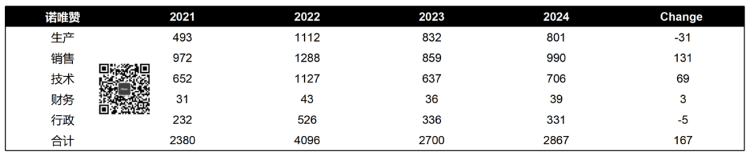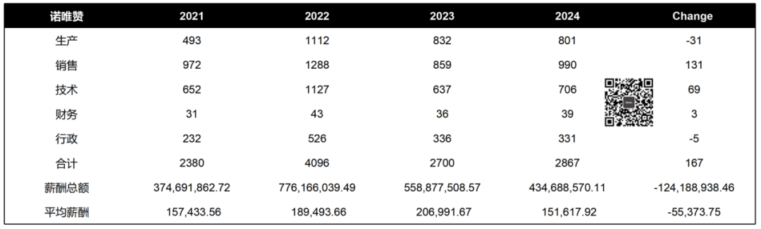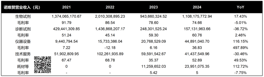 | 诺唯赞早在2025年4月10日就公布了2024年财报,一般情况下敢这么早公布的都是有好事。果然啊,2024年诺唯赞营收13.78亿元,增长7.15%。虽然还是亏损,但是扣非净利润已经从2023年的-1.93亿元收窄至-8321.5万元。2024年宏观环境什么样子大家都知道,能干成这样不容易了。只是,相应的应收账款占比也有所上升,增加了1.43亿元。这不是怪诺唯赞,只是从侧面说明2024的宏观环境是多么的严峻。原有的核心业务生物试剂产品依然占据主要地位,营收11.08亿元。大家可以很明显的看到,生物试剂的毛利率是在一路走低的。所以,按照我粗浅的理解诺唯赞是在一直寻找第二增长曲线。2022年由于新冠业务刺激,诊断试剂冲到14.34亿元的高点,但是这并不能认为转型成功了。随后,诊断试剂业务营收逐步下降到2024年的1.57亿元,退回到了成长培育期。从我们的观察来看,诺唯赞还是在继续押注诊断试剂业务。从医疗器械注册证书上就能看出来一隅,从一类备案到三类都在持续增长。至于仪器设备和耗材,基本可以认为是依附于生物试剂和诊断试剂的,暂时可以不看 。就是仪器设备的毛利率从2023年的6.16%跳涨到了2024年的36.83%,这是为啥?诺唯赞的技术服务继续萎缩,很有可能第二曲线跟他也没关系了。所以,大家观察诺唯赞还是要关注在临床端的拓展情况。诺唯赞之所以2024年营收能够达到7.15%的增长率,最大的功臣是海外市场。我们可以看到,境内收入虽然占绝对主导,达到12.74亿元。然而,总行已经有点乏力了,只有2.94%的增长率。而境外收入则不然,从2023年的4562.6万元暴涨121.85%,达到1.01亿元。这也是诺唯赞2022年开始就一直在干的事,总算有了成果。从统计来看,2024年诺唯赞生产人员削减最多,达到31人。补完后,发现诺唯赞员工平均薪酬从2023年的20.7万元下降到15.2万元。于是我们可以看到从董事长到副总经理的薪酬都有提升,也不多,就涨个60万左右吧。另外,2024年诺唯赞按照每10股分红1.5元计算,董事长当年分红320.8万元。当然我们一直说实控人分红怎样怎样并不是反对,这是上市公司的权利。