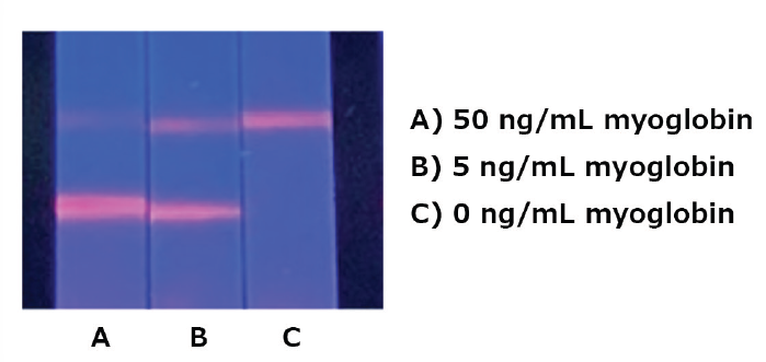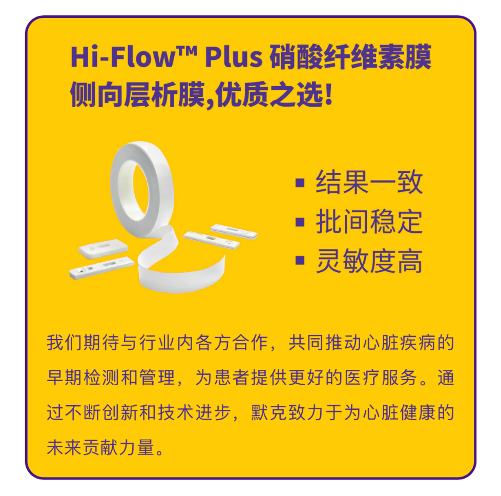 急性心肌梗死 一个令人闻风烂胆的名字!!! 它指的是因冠状动脉狭窄等造成的急性、持续性的缺血缺氧,进而导至心肌坏死。在症状出现后的的最初几小时内,死亡率较高,约30%至50%的心肌梗死患者可能在发病后的一小时内死亡。其生存下来的患者5年内死亡率可能高达20%至30%。根据世界卫生组织(WHO)数据,每年约有1790万人死于心血管疾病(CVDs),占所有全球死亡人数的32%, 成为全球健康的主要威胁之一[1]。 随着人口老龄化和生活方式的变化,心脏疾病的发病率逐年上升,市场对心脏标志物检测的需求也随之增加。POCT(Point of care testing)在心血管疾病的早期诊断中展现出巨大的潜力。传统的心血管疾病诊断方法需要大型医院设备,耗时且不便,而POCT提供了快速、便携和易于使用的替代方案,尤其在资源有限的医疗环境中,越来越受到临床实验室和医疗机构的青睐。 这些优势使得侧向层析成为心脏标志物检测的理想选择,为临床医生提供了更为高效的检测工具。随着技术的不断进步和医疗需求的增加,心血管生物标志物的POCT检测将成为医学领域的重要发展方向 [2]。 图1. 基于POCT检测方法诊断心血管疾病的心脏生物标志物 [2]. 研究表明,肌酸激酶同工酶(CKMB)、肌红蛋白(MYO)、心脏肌钙蛋白I(cTnI)和N末端脑钠肽前体(NT-proBNP)在急性心肌梗死(AMI)患者中的联合检测具有重要价值。这四种生物标志物的联合检测显著提高了AMI的早期诊断灵敏度,达到了92.79% [3]。 使用免疫荧光方法对其进行检测,能够在10到15分钟内同时检测肌红蛋白(Myo)、CKMB和心脏肌钙蛋白I(cTnI)。Myo、CKMB和cTnI的检测范围分别为5 ng/mL到500 ng/mL、1 ng/mL到70 ng/mL和0.05 ng/mL到30 ng/mL。该方法在急性心肌梗死(AMI)患者中显示出高灵敏度和良好的重复性[4]。 图2. 心肌损伤后,cMyC和cTn释放过程 [5] 一份来自内部测试数据显示,使用默克Hi-plusTM 系列膜产品搭配荧光微球,对样品中Myo进行检测,最终实现5-50ng/ml Myo的准确检出。 核心原料配方概览
