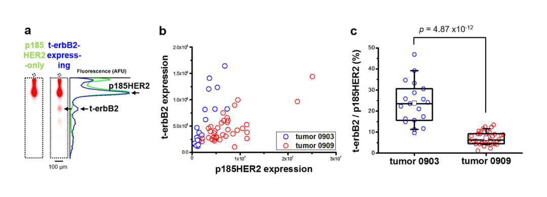 图3:scWestern区分HER2与t-erbB2(左:scWestern结果;右:临床样本验证)。