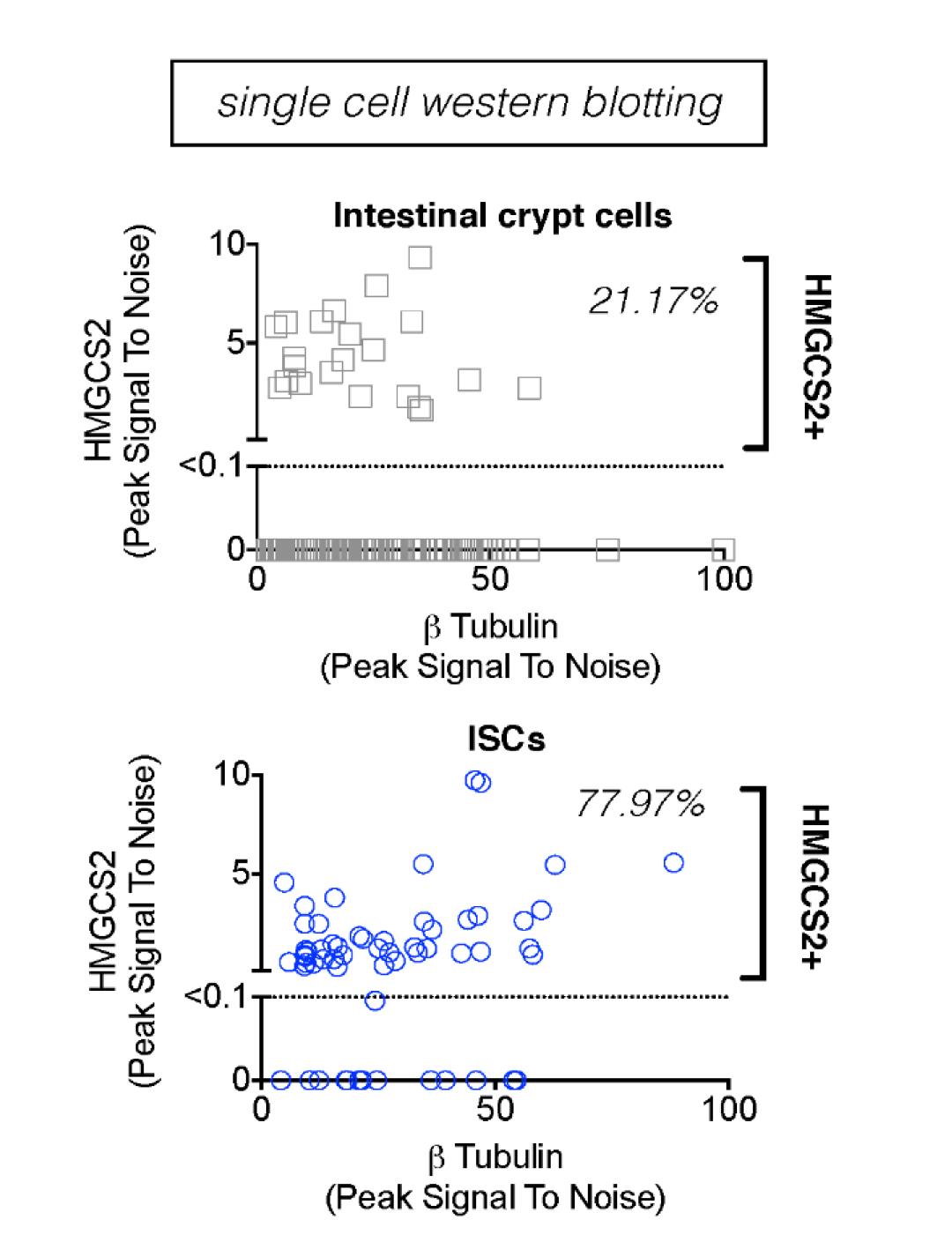 图5:scWestern检测Lgr5+ ISC肠道干细胞中77.97%表达HMGCS2;总肠隐窝细胞群中观察到21.17%表达HMGCS2。