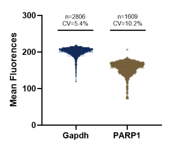 图11: scWestern检测Hela细胞内参蛋白Gapdh与PARP1数据统计结果。显示内参蛋白Gapdh平均荧光强度变异系数CV=5.4%,统计细胞数=2806;靶标蛋白PARP1平均荧光强度变异系数CV=10.2%,统计细胞数=1609。