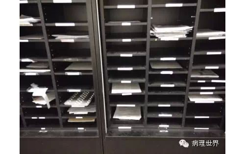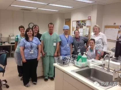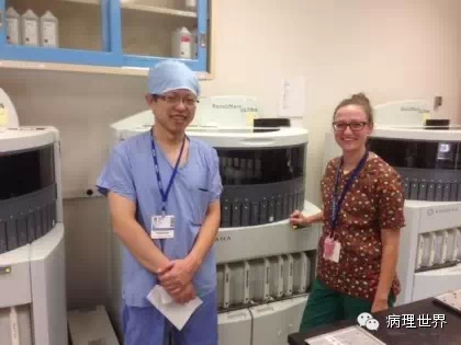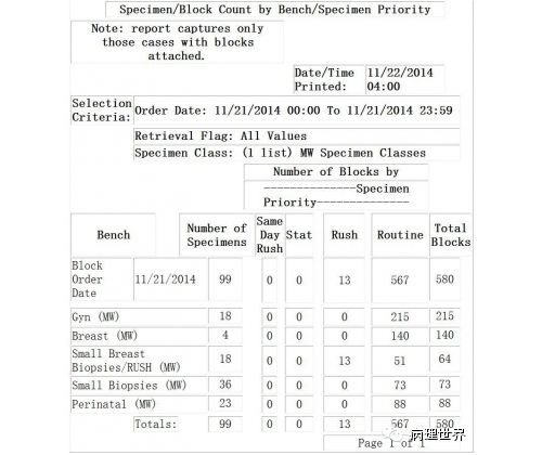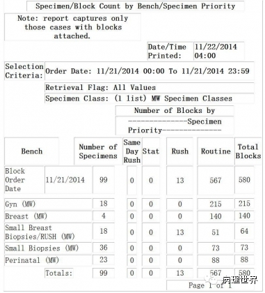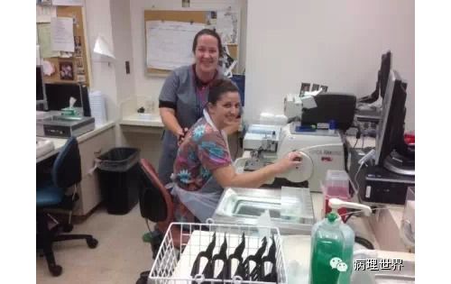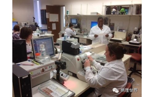 病理技术是病理科的非常关键的组成部分。切片质量直接影响到病理诊断的效率。在Magee-Women Hospital进修期间,我去技术室(常规制片和免疫组化)体验了两天的技术员的工作,有了一定的感性认识。参观技术室首先要做好心理准备。因为技术员的工作是从凌晨4点开始的。因为CAP认证对于诊断时间(turnaround time, TAT)的要求比较严格,大约90%以上的病例第一天取材,第二天早上陆续切片就做好了,当天报告就可以签发。 4:30am的医院景色 4:30我到科里,包埋工作已经开始了,一天大概有800左右的蜡块,三台包埋机,首先是粗针穿刺标本、活检标本;再是大标本、胎盘。每种标本都有不同颜色的包埋盒,方便分类。因为是打号机打的,每一个都先扫描条码,显示具体标本类型、块数。穿刺组织放在蜡中会用一个小金属块(外形类似砝码,下面的形状是不同大小的长方形)压一下,同时放在滴蜡出口旁的小冰台上迅速放一下,最下面的蜡就凝住了,组织也就被固定住了。大的组织也可以用大的金属块压,也有用手指压的(没手套),手指再习惯性地冰上撮一下,蜡就掉了。有些长条形的管状的标本要竖着包埋,取材时不需要切,包埋盒上画个记号(⊙),包埋时再切成几段,包埋面就十分清楚了。刮宫标本都是用小口袋装的,用擦镜纸样的纸制成的,取材时连组织带水倒进去,大小刚好与包埋盒一样,也不会出现交叉污染。标本脱水完、纸一揭就是平平的完整的一块组织或是少一些的,用钝刀片刮下来,非常方便。 包埋进行过程中,切片就开始了。过程差不多,每一台切片机配一台电脑、一台标签打印机,扫一下条码,标签就打印了,穿刺标本往往要打印10多张标签。小标本要求有3个切面,穿刺标本小,每个切面相隔20μm,完整的5张一条共3条漂在水里。3张载玻片是一头是白色的,是普通的HE染色用的,每一条的第一张捞起。余下的4*3,12片用红色头的载玻片(用来做免疫用的)捞起自然晾干,如果需要可以用来做免疫。如果不需要,就扔掉了。活检标本的3个切面间隔是40μm都是严格操作的。另外有些不同的是蜡块不是直接放在冷冻台上的,而是用一个玻璃盆放点水,放在冷冻台上,再把蜡块放在冰水里,他们说这样表面有点水气容易切,特别是小标本。同样的玻璃盆也用在漂片的时候,会不会水温均恒些就没有问了。 免疫组化也是4点多就开始了,同样切片、打印标签。有7台自动染色机,Roche的6台、1台Leica Bond。4台新的Roche可以30张切片随时放入和拿出,这样会效率提高很多。Magee有大约60多种标记。如果没有的标记,切好片直接就送到UPMC其它医院去了。阳性对照组织会预先切好,放在标签一头。根据不同的标记有不同的对照组织。每一张免疫都有阳性对照,在其它医院做的就会有两张切片,一张是需要的、一张是阳性对照片。每一个蜡块还有两张阴性对照。 制片的时效性。从早晨8点开始,就源源不断地把当天的切片分给每一个病理医生,诊断工作就可以开始了。一般小标本会最早出来,特别是乳腺的穿刺标本,可以及时的开出免疫组化。11点之前定出的,当天下午就可以出片。11点之后的第二天出片。 工作量。13个技术员,每年的病理量是32000,HE切片有近22万。免疫组化30000多。每天切片大约1000张左右。 每张IHC切片的红线左边是阳性对照组织。中间两张是阴性对照。 切片室,切片机上面是打印标签的打印机 免疫组化室 Roche免疫组化机器 技术员 每日工作量清单 技术员会分批把制好的切片放在第一个医生的小格子里。 来源:病理世界 |