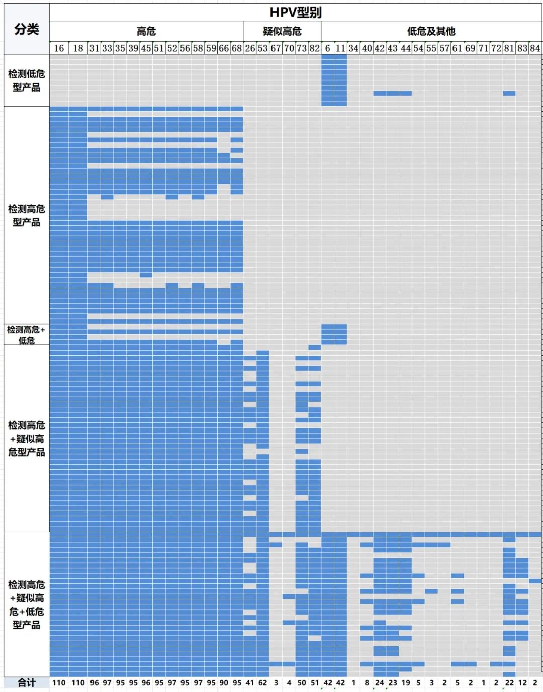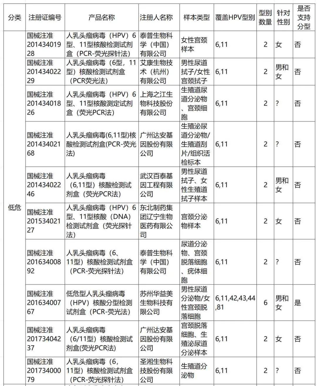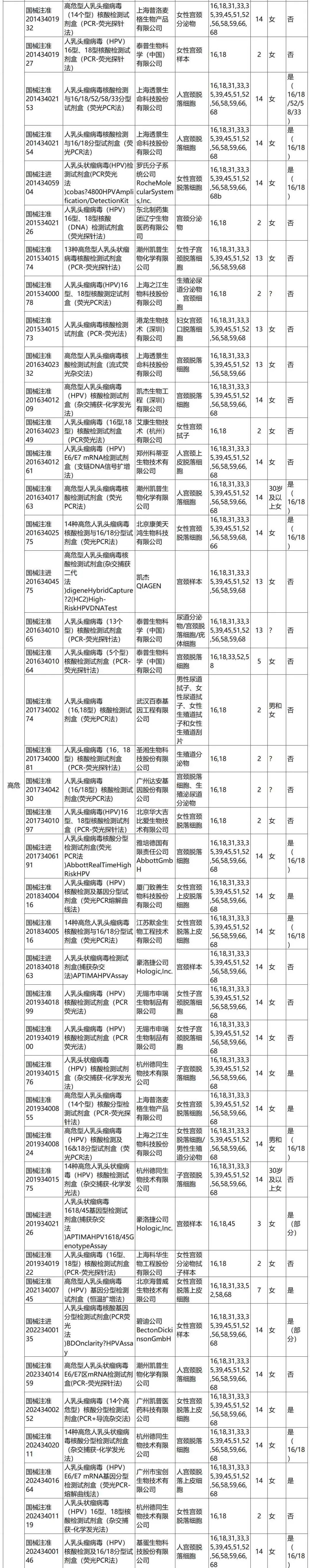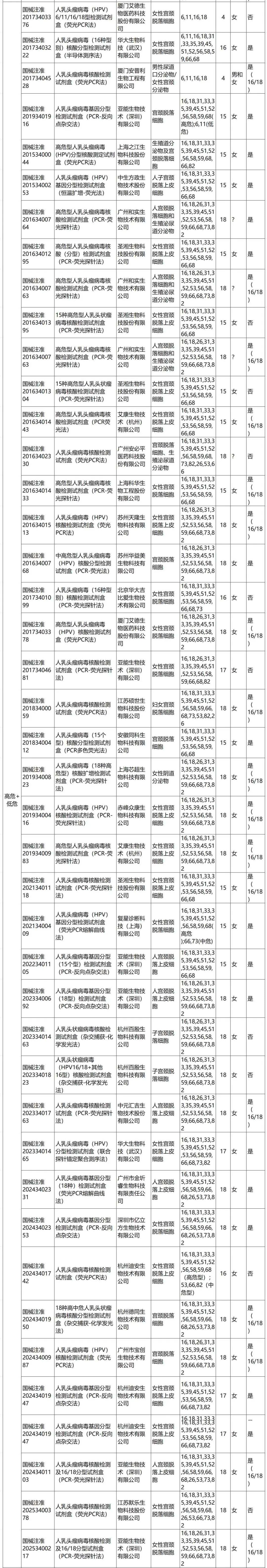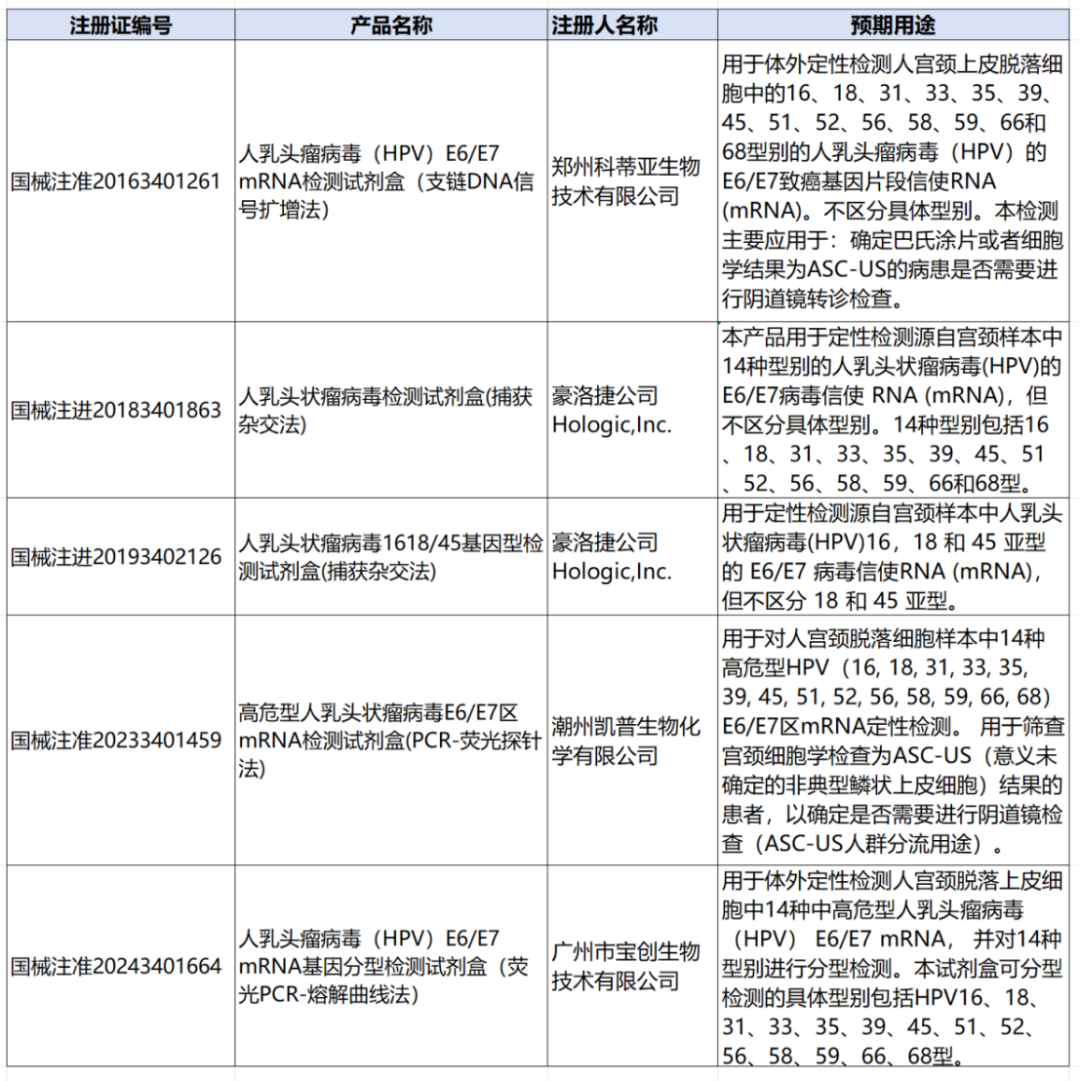 04 HPV检测在宫颈癌筛查中的价值 HPV常用的筛查方法包括肉眼观察法、子宫颈细胞学检查、HPV检测及细胞学+HPV检测联合筛查方法。同时,子宫颈细胞 P16/Ki67 双染色、HPV整合检测、DNA 甲基化及DNA 倍体检测也逐步应用于HPV诊治分流过程中。其中HPV检测在宫颈癌筛查中具有如下意义: 1、WHO及国内指南推荐,HR-HPV核酸检测是HPV初筛的首选方法。 2、细胞学检查出现未明确诊断意义的不典型鳞状细胞(ASC-US)时,HR-HPV检测进行患者分流。 3、HPV检测联合子宫颈细胞学进行初筛可提升检测性能。 4、HPV定性检测阳性时,可进行HPV分型检测或阴道镜检查。 05 国内HPV检测产品现状分析 1、产品分类概况 检索DataMed数据库,当前共有123款HPV检测相关试剂盒获批(附录一)。 按照检测的HPV型别属于高危、疑似高危和低危型分,当前试剂盒中检测高危型HPV、高危+疑似高危、高危+疑似高危+低危的试剂盒占比较高,分别达到42、36、28款(图 1)。 有3款高危型HPV甲基化检测试剂盒。根据中国子宫颈癌筛查指南(二),PAX1、ZNF582、SOX1、JAM3、ASTN1、DLX1、ITGA4、RXFP3、SOX17、ZNF671 单独或联合甲基化检测在 HPV 阳性人群中检出宫颈上皮内瘤变3级(CIN3)或更严重的病变(CIN3+)具有较好的特异度,可降低阴道镜转诊率,避免了过度治疗和造成患者不必要的焦虑。 当前获批产品中覆盖了POX1, JAM3及SOX1三个基因的甲基化检测。(表1) 图1 按照产品预期用途分类,国内获批HPV检测产品的构成情况。注:参考2012年国际癌症研究机构HPV分类,结合国内标准做校正,初步参考分类如下:高危:16、18、31、33、35、39、45、51、52、56、58、59、66、68;疑似高危:26、53、67、70、73、82;低危:6、11、40、42、43、44、54、61、72、81、89 表1 获批的HPV甲基化检测相关产品 2、产品覆盖检测型别概况 除甲基化检测外的120款HPV检测试剂盒,共计覆盖了37个HPV型别,各试剂盒覆盖型别覆盖情况详见图2 图2 获批试剂盒HPV型别覆盖情况 。注:每行代表一个产品,蓝色表示该产品覆盖了此型别HPV。参考2012年国际癌症研究机构HPV分类,结合国内标准做校正,初步参考分类如下:高危:16、18、31、33、35、39、45、51、52、56、58、59、66、68;疑似高危:26、53、67、70、73、82;低危:6、11、40、42、43、44、54、61、72、81、89 3、HPV定性检测与分型 从产品的适用范围中提取分型信息,除甲基化外120款HPV检测产品中,支持HPV分型的产品共计77款,占比64.2%,其中只支持HPV16及18分型的产品有25款。(图2 附录一) 图2 获批HPV检测产品是否支持HPV分型情况概览 3、检测样本类型分析 整体看,当前获批产品中检测样本类型包括宫颈样本(分泌物、脱落细胞)、生殖泌尿道相关样本(阴道分泌物、男女生殖道拭子、尖锐湿疣体表面脱落细胞等)。(附录一) 尚无采用尿液做HPV检测的Ⅲ类产品获批。 4、检测对象分析 根据样本类型和产品适用范围分析,123款产品中有7款产品可同时进行男性和女性HPV检测。(图3,附录一) 图3 获批检测产品针对的目前人群性别情况分析。 5、产品预期用途分析 根据产品适用范围/预期用途,6款产品在其预期用途中明确可用于筛查,4款产品明确不可用于筛查及分流管理,其他产品未明确相关信息。(表2 附录一) 表2 产品适用范围/预期用途中声明可用于筛查的产品信息 6、检测方法 除3款甲基化检测试剂盒,其余120款检测产品中所用的检测方法多样,涉及PCR相关检测方法、杂交捕获、基因芯片、恒温扩增、二代测序及半导体测序等各类检测方法。(附录一) 此外,有5款产品选择以HPV的E6/E7致癌基因片段信使RNA (mRNA)为检测目标(附表一) 总之,当前国内HPV检测产品数量达到123个,呈现HPV型别覆盖全面、检测方法多样、检测覆盖男性和女性等特点。但检测样本类型仍以宫颈及生殖道样本为主,无获批Ⅲ类的尿液检测产品。产品适用场景仍以实验室检测为主。 附表一 国内获批的HPV检测产品 参考文献: 中华医学会妇产科分会感染协作组 女性下生殖道人乳头瘤病毒感染诊治专家共识 中国抗癌协会宫颈癌专业委员会 子 宫 颈 癌 筛 查 规 范(2025 年 版) 中国优生科学协会阴道镜和宫颈病理学分会等 中国子宫颈癌筛查指南( 二) WHO Target product profiles for human papillomavirus screening tests to detect cervical pre-cancer and cancer 国家卫健委员等《加速消除子宫颈癌行动计划( 2023—2030 年) 》 |