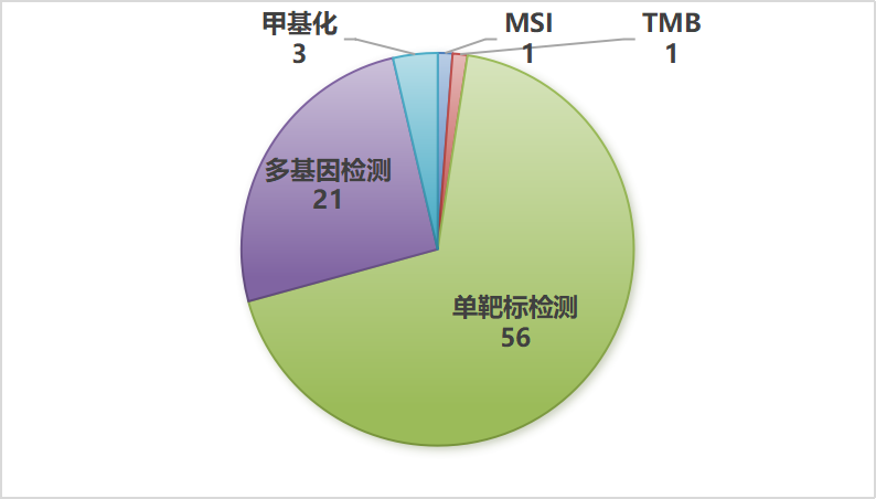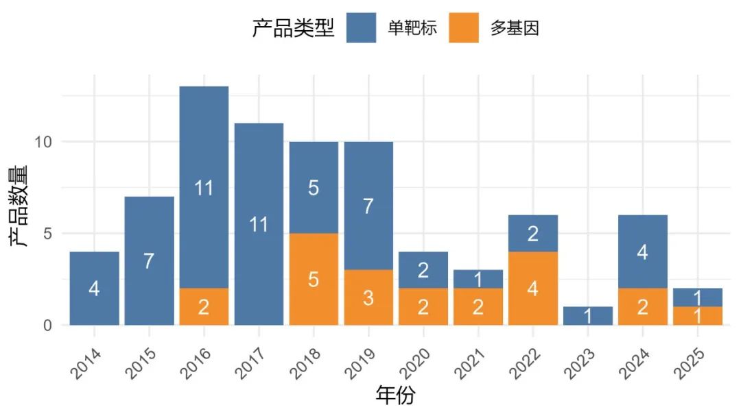 2015年1月20日,美国总统奥巴马在国情咨文演讲中第一次提到精准医疗医疗计划。同年,我国也成立了中国精准医疗战略专家组。因此,2015年也被称为精准医疗的元年。 肿瘤的发生发展中受遗传、环境、基因突变等多因素的影响,是精准医疗关注的核心疾病。2015年后,国内外大量专注肿瘤诊断的公司成立。据天眼查统计,仅2015年一年,我国就成立了约40家肿瘤诊断相关企业。如今,肿瘤精准医疗10年已过,本次结合现有数据,浅析国内肿瘤检测的发展历程。 肿瘤检测涉及基因数量多,产品设计相对复杂。大panel检测产品审批困难,并多以LDT或外送形式进行检测,产品信息收集较困难。因此,本次仅针对NMPA批准的肺癌检测产品做初步分析。 肺癌的伴随诊断是一种与靶向药物治疗紧密关联的体外诊断技术,通过检测患者肿瘤组织或体液中的特定生物标志物,筛选出最可能从特定靶向药物中获益的患者群体,从而实现个体化精准治疗。 伴随诊断是肿瘤基因检测中发展最早,应用相对成熟的一类检测。同时也是肺癌诊断获批产品数量最多的一种场景。 根据2025年5月23日发布的非小细胞肺癌 NCCN指南2025.V4版,NSCLC的分子检测和靶向治疗关键靶点如下表所示。共建议检测16个基因变异+3个蛋白表达。 表1 NCCN指南中非小细胞肺癌的分子检测靶标 注:来源于Biomarker传送门微信公众平台 截至2025年4月,国内已获批的肺癌靶标检测产品约82款,其中包括单靶标检测56款,多基因检测21款,基因甲基化检测产品3款,MSI(微卫星不稳定性)及TMB(肿瘤突变负荷)检测产品各1款。(图1,附录二) 图1 国内肺癌获批检测产品构成情况(除血清标志物检测相关产品) 82款产品中,共涉及45家检测公司,其中厦门艾德生物获批产品数量最多,达12款产品。(附录二) (1)伴随诊断产品分析: 现有伴随诊断产品约77款,自2014年开始,伴随诊断产品获批数量呈现先增加后逐步减少的趋势,2016—2019年迎来相关产品获批高峰。(图2) 图2 不同年份获批的伴随诊断产品数量 单靶标检测: 56款单靶标检测产品主要关注EGFR, BRAF, ALK, PD-L1等共计7个标志物(图 3)。其中有6款EGFR基因检测产品支持血液样本检测,其他产品检测样本类型均为组织或FFPE。 图3 单靶标肺癌检测产品构成情况 多基因检测: 共有21款多基因检测产品,共计覆盖10个基因的相关突变(图4,附录一)。其中艾德生物的人类10基因突变联合检测试剂盒(可逆末端终止测序法)为国内覆盖靶标数量相对全面的检测产品。 图4 国内获批的多基因检测产品靶标覆盖情况,蓝色表明该产品检测该基因的突变 总之,从每年获批产品数量上看,相较于14-19年,20-25年各厂家对肿瘤伴随诊断产品报证数量有一定下降。推测可能原因是:1、随着临床研究的深入,实际检测过程中,临床可能需要更大的检测panel,此时申请注册证面临投入大、审批困难的问题。2、外送检测及LDT模式的提出促使更多检测公司精力投入发生变化。 (1)由组织活检向液体活检拓展 从现状分析也可以看出,以往获批产品中主要以组织或FFPE样本为检测目标。随着液体活检技术的兴起,采用血液、尿液等液体样本检测ctDNA(循环肿瘤DNA)或CTC(循环肿瘤细胞)在肿瘤检测中发挥着越来越重要的作用。 早期筛查、肿瘤分型、用药指导、耐药性评估、预后评估及术后复发监测,液体活检已贯穿肿瘤发生发展检测的全流程,有效补足了组织活检的缺陷。(图5) 图5 液体活检的临床应用场景 (2)由伴随诊断,到复发监测,再到早期筛查 1、肿瘤复发或预后监测 MRD,全称为minimal resideal disease,即微小残留病灶,最早用于白血病完全缓解后预测复发风险和指导后续治疗。 实体瘤中,疾病经治疗后(如手术后),通过循环肿瘤DNA等肿瘤来源的分子异常,可发现影像学或传统实验室方法不能发现的潜在病灶,代表着肿瘤的持续存在和临床进展可能。在结直肠癌、非小细胞肺癌和乳腺癌中,有充分证据表明MRD具有预后分层作用,临床价值较明确。 目前可先通过大panel组织检测或全外显子组织样本检测,来获得病人的基因突变信息,在此基础上制定个体化方案对患者进行监测。也可建立固定panel对患者开展MRD检测。 2、泛癌早筛 近年来,伴随着甲基化测序技术的成熟,肿瘤早筛,尤其是泛癌早筛成为各大厂家的竞争热点。 除外采用PCR相关技术针对关键基因进行甲基化检测外,目前,采用NGS技术进行泛癌早筛的策略主要有以下几种: a. 基于ctDNA/cfDNA的片段组学策略