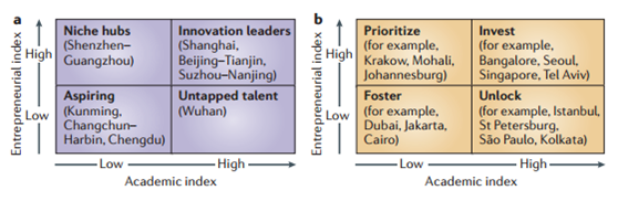本文收集、分析了八个中国生物产业区的数据,分析结果显示,在新兴市场国家进行投资需要注意两方面活动的强度:企业活动和学术活动。企业活动通过创新创业型生物技术公司和CRO公司数量来评估,学术活动由发表文章、被引用次数和研究结构的排名评估。基于每个生物产业区的企业活动和学术活动将其列入2*2的四格表中(图1a)。 生物产业区通过上述方法被分为四大类,创新领导区、尚待开发潜力区、利基中心市场区和亟待发展区,此分类框架能够给新兴市场国家政府制定政策和投资决定提供指导性建议(图1b)。 对于创新领导区,政府应加强投资,实施的方法可多种多样,如增加研究机构的研究基金、加强创业的激励政策、研发中基础研究和创新研究投资。除上海和北京外,再现有的投资政策能够持续的情况下,其他新兴市场国家和地区中,可成为创新领导区的有特拉维夫、首尔、班加罗尔和新加坡。 对于尚待开发的潜力区,需要鼓励将实验室的科研成果转化为产品,政府政策将着重于开发创新潜力,如促进创业的相关配套措施、项目和早期风险融资及人才投入。苏州已成为国际领先的医疗器械产业园区,当地政府通过为企业和研发机构提供实验室、主要的配套设施、商业计划开发和资金网络促进了产业园区的发展。武汉的生物产业园区目前正在通过类似的激励措施开发其潜力,在其他新兴市场中属于该分类的还有圣彼得堡、伊斯坦布尔、加尔各答、圣保罗和墨西哥城。 利基中心市场区主要通过当地优势强项建成中心,如华沙的临床试验中心,以及古尔冈医疗健康信息技术中心。。深圳目前已成为国际领先的生物信息产业区,主要归功于政府强有力的资金和支持,利用深圳当地计算、电子及信息技术方面的优势和资源,华大基因已成为该地区领先的企业 亟待发展的生物产业区需要长期的、提高企业活动和学术活动方面的计划,迪拜尽管有着强大的经济基础和良好的国际贸易交流,但仍然无法在科技创新方面取得成就,其原因主要是缺乏强有力的学术支持,而新加坡由于新加坡国立大学的存在,拥有领先的学术能力,已经成功克服了这一劣势。 将中国的研究结果应用于其他新兴市场可能会有一些差别,此分析框架不是为了提供精确的投资策略,而是给政策制定者在制定生物产业区投资政策时提供一个技术分析方法。例如印度政府近期考虑投资三个生物产业区:班加罗尔、摩哈里和费尔达巴德,模型显示班加罗尔应当被当作创新领导区进行投资建设,摩哈里应当作为利基中心市场区投资,发展其优势农产品生物科技技术,而加尔各答因为学术活动活跃可将其作为尚待开发潜力区投资发展。 现实情况许多国家的投资政策受当地客观条件的影响,但是如果新兴市场政府想发展像波士顿、旧金山和英国剑桥这样的生命科学创新产业区,那么投资政策需要具有策略性。 图1 新兴市场的投资策略框架. a生物产业园区框架;b.投资策略框架