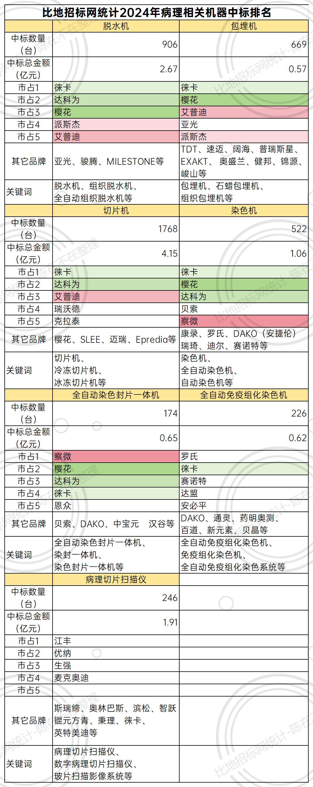 我们根据比地招标网的统计,罗列2024年以下设备的中标排序前五名以及其它企业。 脱水机 包埋机 切片机 染色机 全自动染色封片一体机 全自动免疫组化染色机 病理切片扫描仪