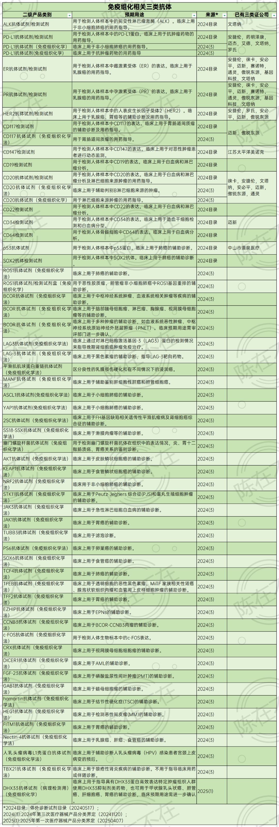 多重免疫组织化学是一种在一张组织切片上同时检测多种抗原的技术。 多重免疫组织化学试剂盒目前均未获证。但是有两个六标七色的产品分类界定为三类。 p40/p63/NapsinA/TTF-1/Synaptophysin/Chromogranin A检测试剂盒 (免疫组织化学法): 由p40抗体试剂、p63抗体试剂、NapsinA抗体试剂、TTF-1抗体试剂、Synaptophysin抗体试剂、Chromogranin A抗体试剂、荧光480试剂、荧光520试剂、荧光570试剂、荧光620试剂、荧光690试剂、荧光780试剂、HRP标记二抗、抗体稀释封闭液、荧光DAPI试剂、荧光稀释液组成。用于定性检测中性甲醛固定、石蜡包埋的人肺癌组织样本中p40、p63、NapsinA、TTF-1、Synaptophysin、Chromogranin蛋白。临床上用于肺癌的辅助诊断。 CD3/CD8/CD19/CD23/CKpan/Ki-67检测试剂盒 (免疫组织化学): 由CD3抗体试剂、CD8抗体试剂、CD19抗体试剂、CD23抗体试剂、CKpan抗体试剂、Ki-67抗体试剂、荧光480试剂、荧光520试剂、荧光570试剂、荧光620试剂、荧光690试剂、荧光780试剂、荧光DAPI试剂、HRP标记二抗、抗体稀释封闭液、荧光稀释液组成。用于定性检测中性福尔马林固定石蜡包埋(FFPE)组织切片中CD3、CD8、CD19、CD23、CKpan、Ki-67蛋白,从而检测人体肿瘤组织中的三级淋巴结构,临床上用于实体肿瘤的预后评估。