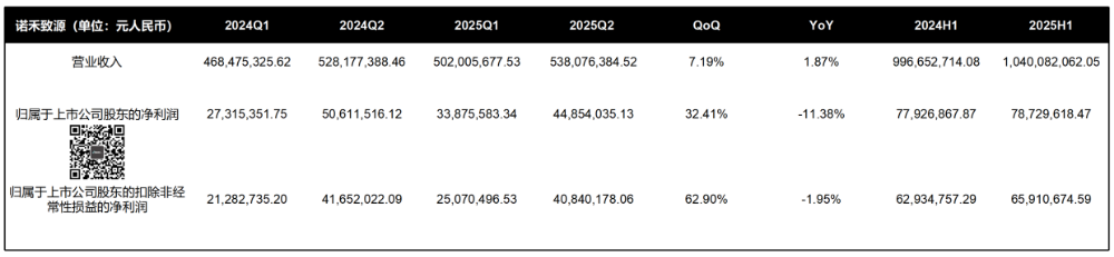 | 还是继续咱们的财报闲聊,再强调下,国内季报和半年报结构差距太大,有些数据不可比。诺禾致源2025H1营收10.40亿元,同比增长4.36%。归属上市股东净利润7872.96万元,同比增长1.03%。扣非净利润6293.48万元,同比下滑4.52%。2025Q2虽然营收达到5.38亿元,同比增长1.87%。但是,归属上市股东利润下降到4485.40万元,同比下滑11.38%。好在,扣非后几乎与去年持平,达到4084.02万元,略微下滑1.95%。这可能与诺禾毛利率下滑有关,去年同期主营业务毛利率大概是41.71%,今年则为40.82%。根据公开的财报信息,生命科学基础科研服务毛利率51.12%,相较于去年同期下滑了1个百分点。营收占比过半的测序平台业务毛利率也略微下滑,达到31.66%,相较于去年下滑0.5个百分点左右。当然,这在今年已经算优秀了...可以参考咱们前两天的万孚、迪安...诺禾致源海外营收已经从我们2021年跟踪的占比35.72%提升到了2025H1的51.28%!根据公司的研发人员数量和占比反推了下员工数量,与2024年相比几乎没什么太大变化,还是稳的。另外,蒋智老师继2024年增持16万股后再次选择减持523.21万股诺禾股票。目前,持股数量已经降至343.06万股,再来一次就差不多清仓了。特别想知道这个员工1是怎么能批出来50万备用金的...