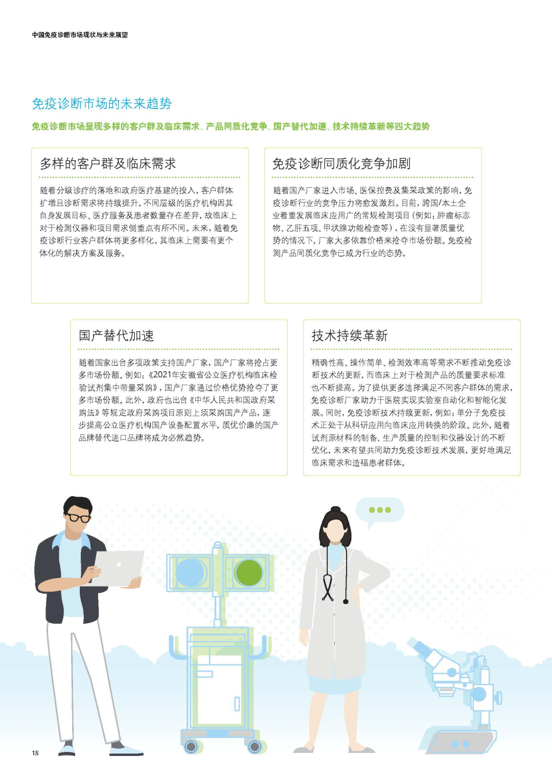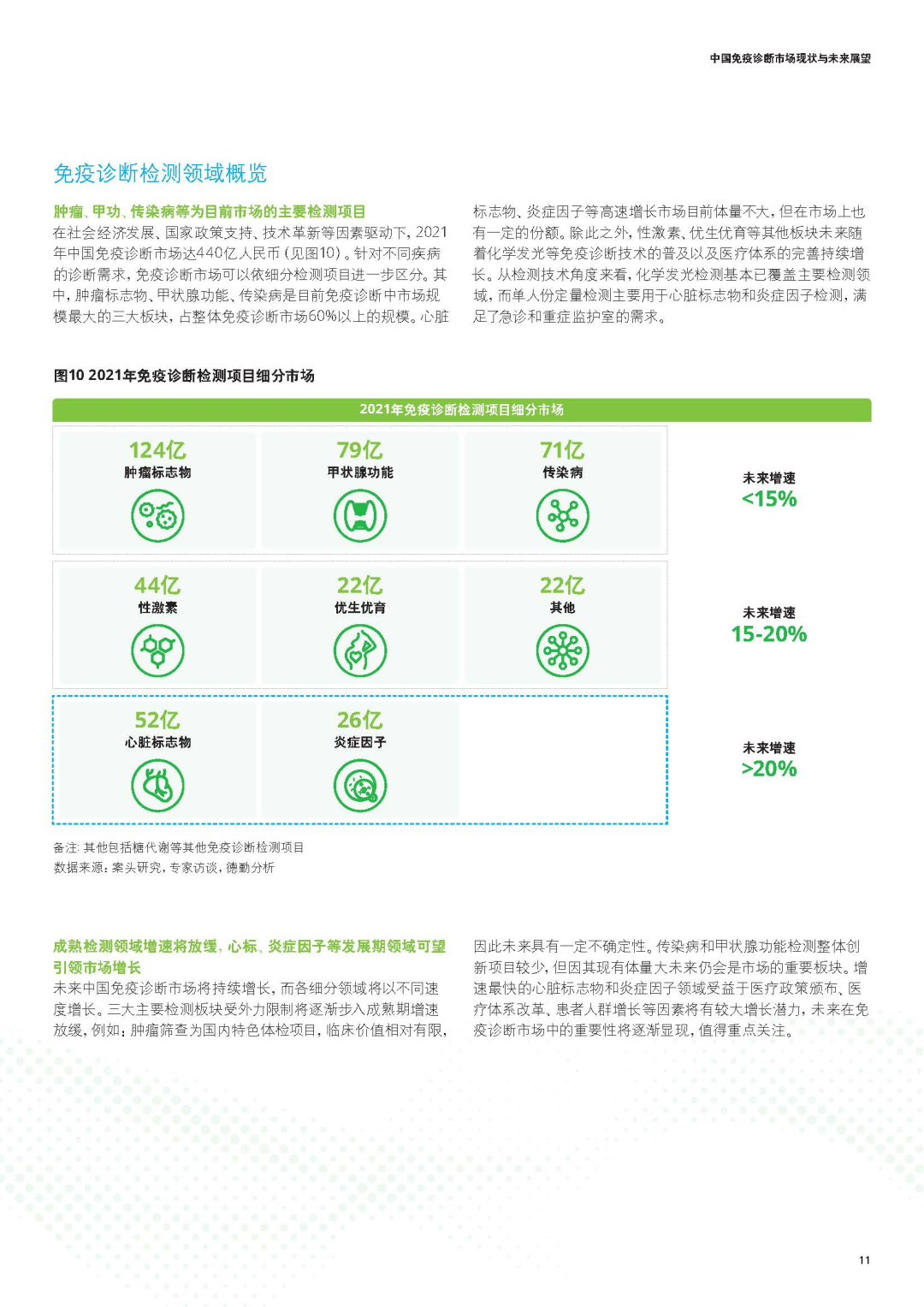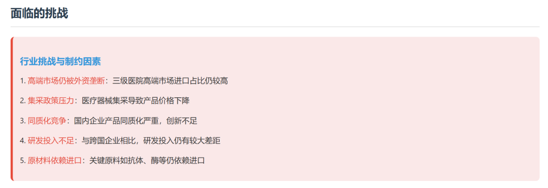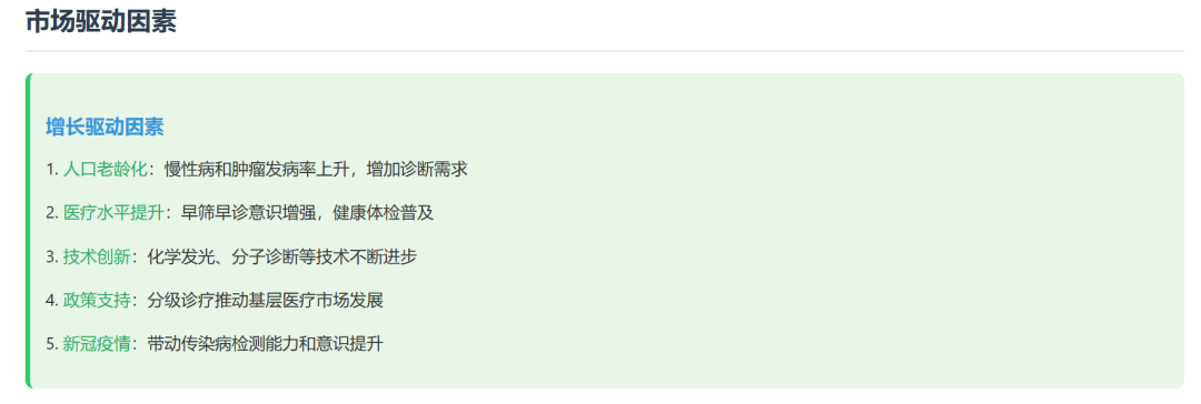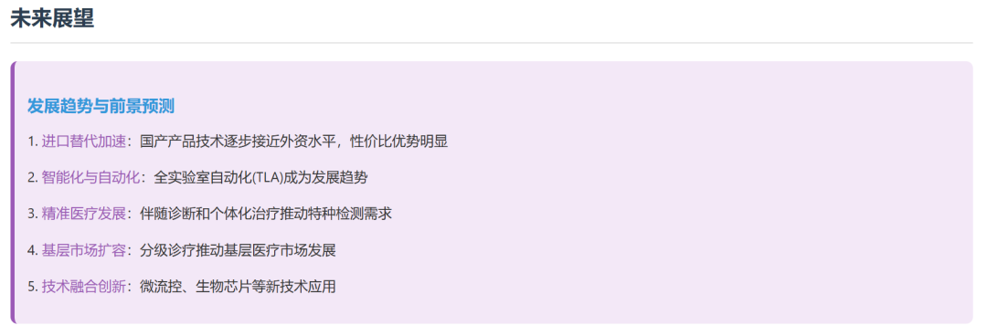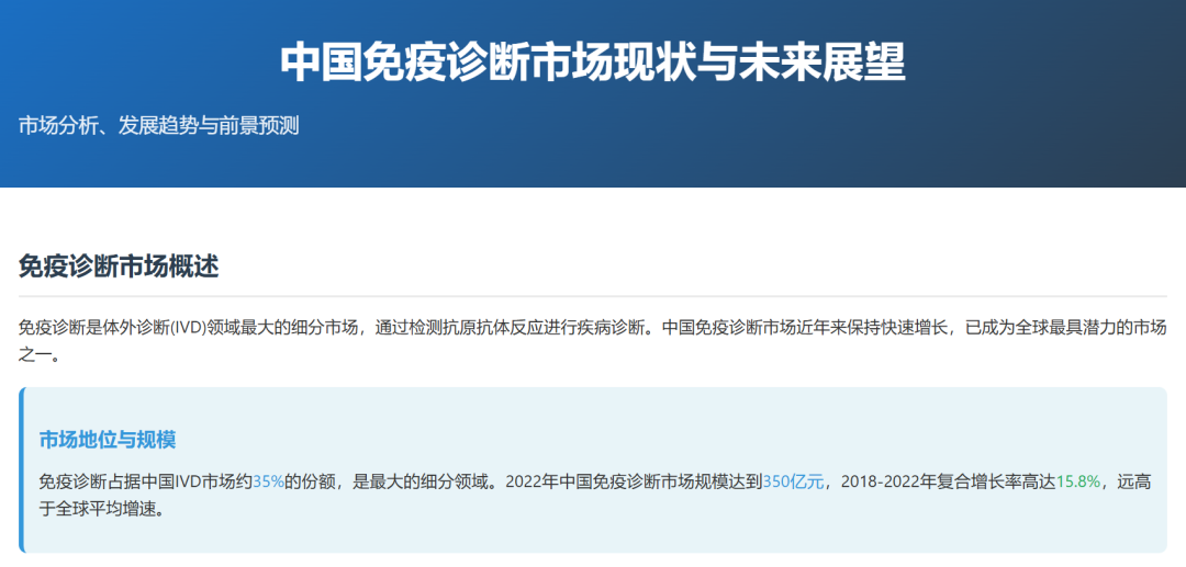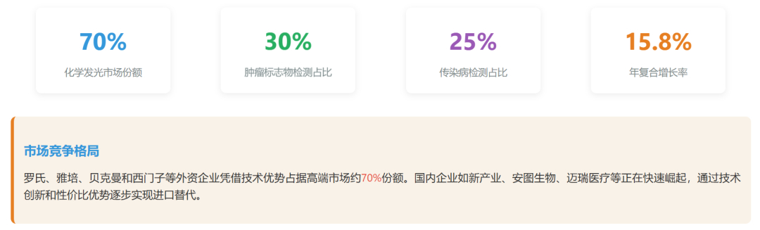 中国免疫诊断市场现状与未来展望 市场现状分析技术平台分布化学发光免疫分析(CLIA)已成为主流技术,占据免疫诊断市场70%以上份额,取代了传统的酶联免疫(ELISA)技术。化学发光法因其高灵敏度、自动化程度高和检测速度快等优势,在医院市场迅速普及。 应用领域分布肿瘤标志物检测是免疫诊断最大的应用领域,占比约30%;传染病检测位居第二,占比约25%;甲状腺功能、激素、心脏标志物等检测分别占据重要市场份额。 主要国内企业市场份额市场规模预测预计到2025年,中国免疫诊断市场规模将达到550亿元,2023-2025年复合增长率预计为14.5%。到2030年,市场规模有望突破800亿元,成为全球最大的免疫诊断市场之一。 未来发展重点1. 加强核心技术研发,突破"卡脖子"技术 2. 推动产学研结合,加速创新成果转化 3. 拓展海外市场,提升国际竞争力 4. 开发差异化产品,避免同质化竞争 5. 布局POCT和家庭诊断等新兴市场 |