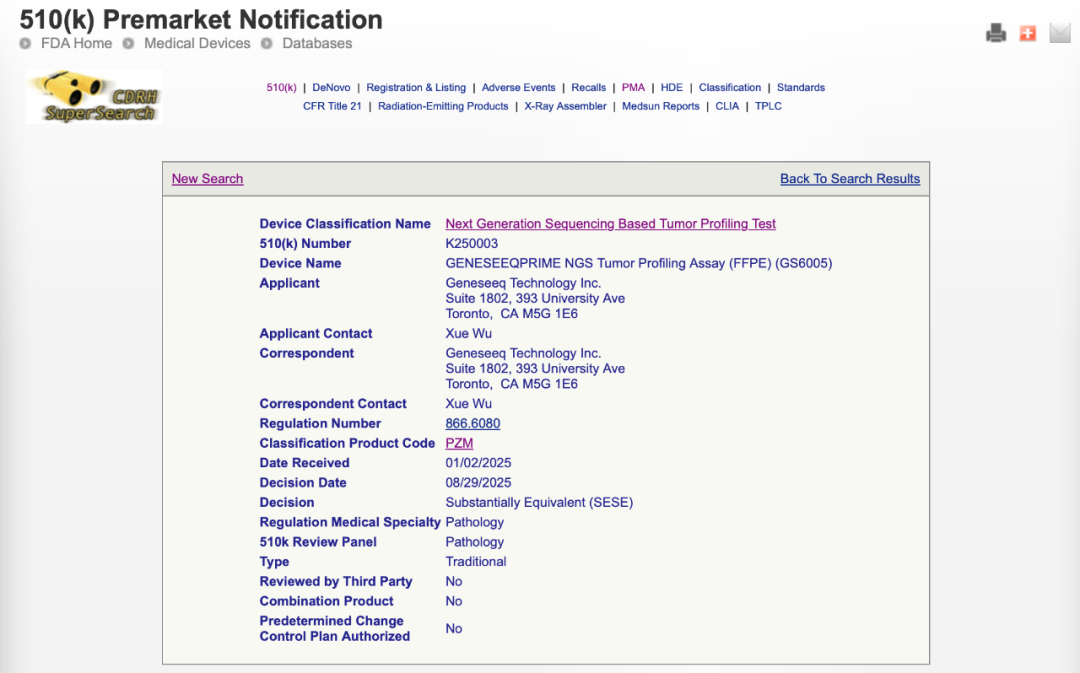 从FDA的官方信息来看,Geneseeq PRIME是走的510k审批路径,设备类型是Next Generation Sequencing Based Tumor Profiling Test。